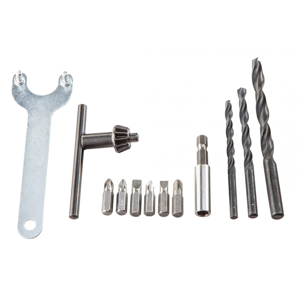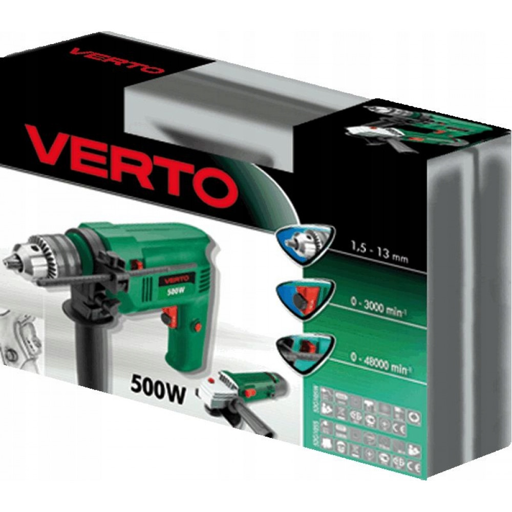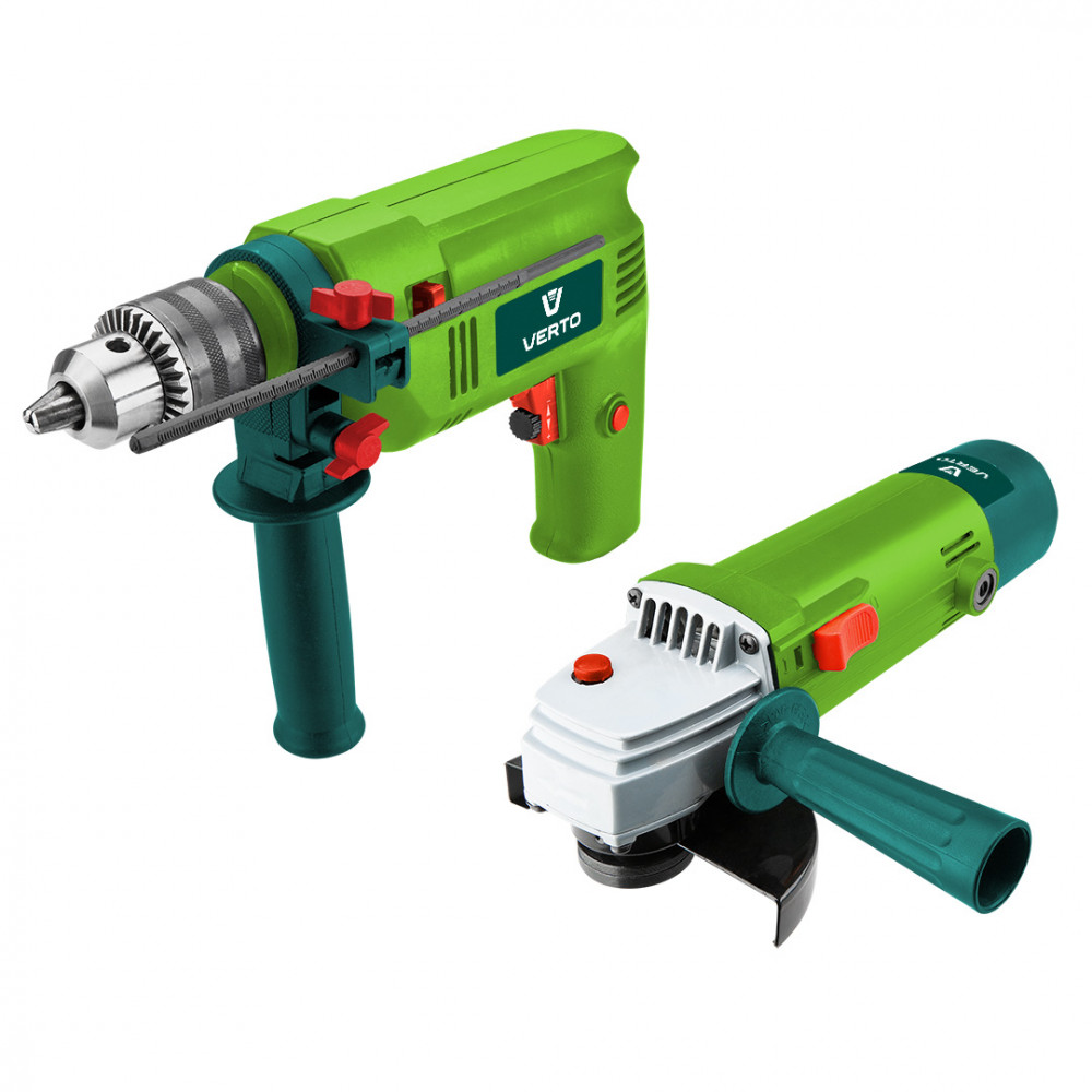 Набор электроинструмента VERTO в состав набора входят ударная дрель мощностью 500 Вт с ключевым патроном 13 мм, а также угловая шлифовальная машина 500 Вт, работающая с дисками диаметром 115 мм. Параметры электроинструмента, входящего в состав набора, позволяют выполнять мелкие ремонтные работы, включая сверление с ударом отверстий в бетоне, сверление без удара отверстий в древесине, керамике или стали, а также разрезать и шлифовать с помощью угловой шлифовальной машины. Соответствие европейским стандартам в области безопасности подтверждает сертификат CE.