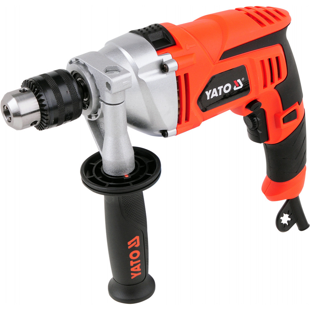 YT-82040 – это ударная дрель от ТМ YATO. Такие ударные дрели также называют пистолетными, они используют ключевой патрон, диаметр которого обычно не превышает 13мм. Дрели YT-82040 обладают постоянной скоростью вращения и имеют специальный ограничитель частоты вращения. Для работы с дрелью можно использовать два режима: просто сверление и сверление с ударом. Мощность дрели составляет 900Вт, она способна производить до 2800 оборотов в минуту. Дрель рассчитана на работу от электросети. Вес инструмента равен 2,25кг.