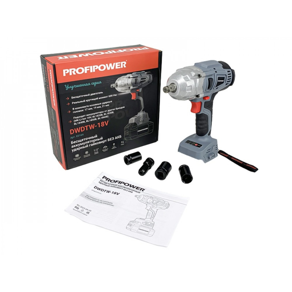 Гайковерт E0164 бесщеточный ударный ProfiPower DWDTW-18V - это надежный и мощный инструмент, который станет незаменимым помощником в выполнении различных строительных и ремонтных работ.