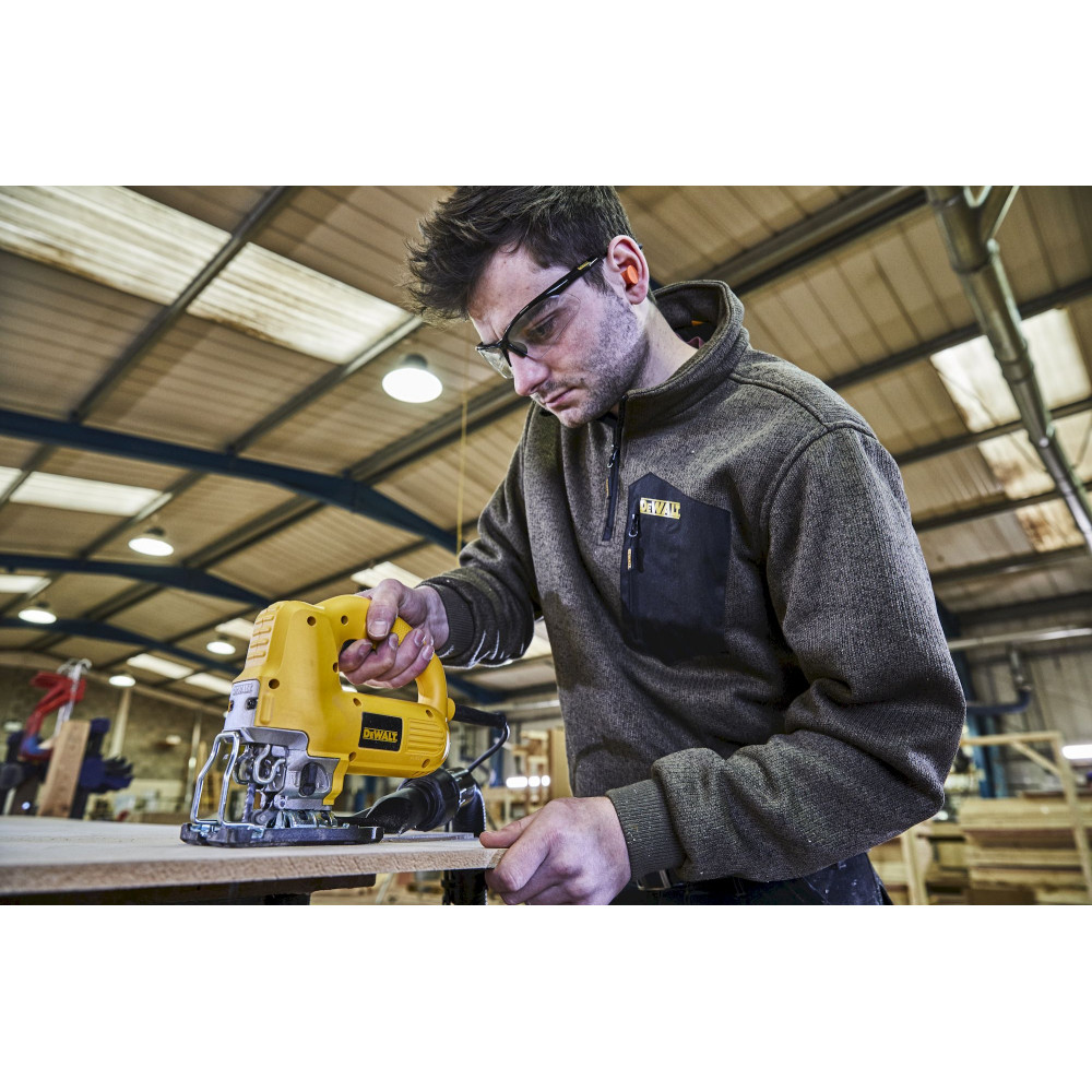 Электролобзик DW341K-QS оборудован низкопрофильным пылеотводящим экраном и встроенной системой выдува опилок, что дает возможность прекрасно видеть линию реза. Производитель позаботился не только об эффективности пользования, обеспечив возможность использования с параллельной направляющей или круговой направляющей для более точного резания, но и об удобстве, предусмотрев компактный и эргономичный дизайна.