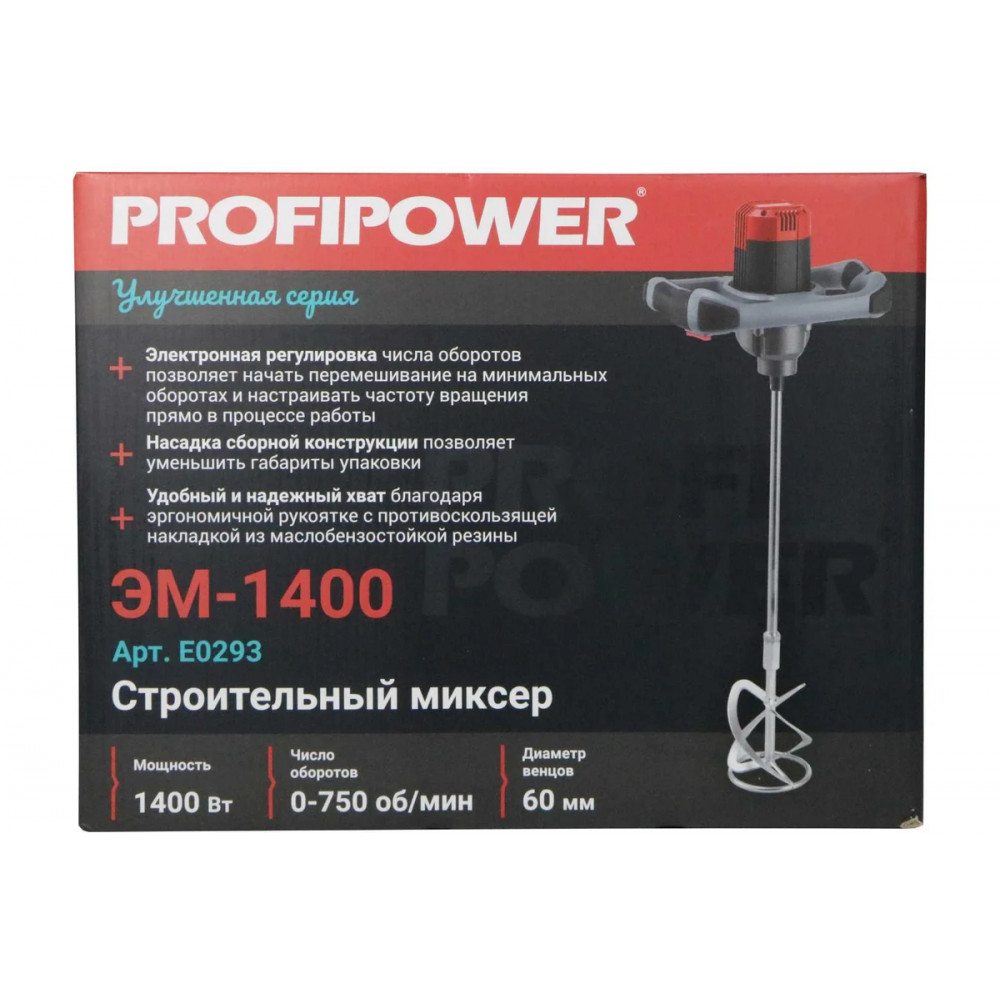 Строительный миксер PROFIPOWER ЭМ‑1400 — профессиональный электроинструмент для приготовления строительных смесей.