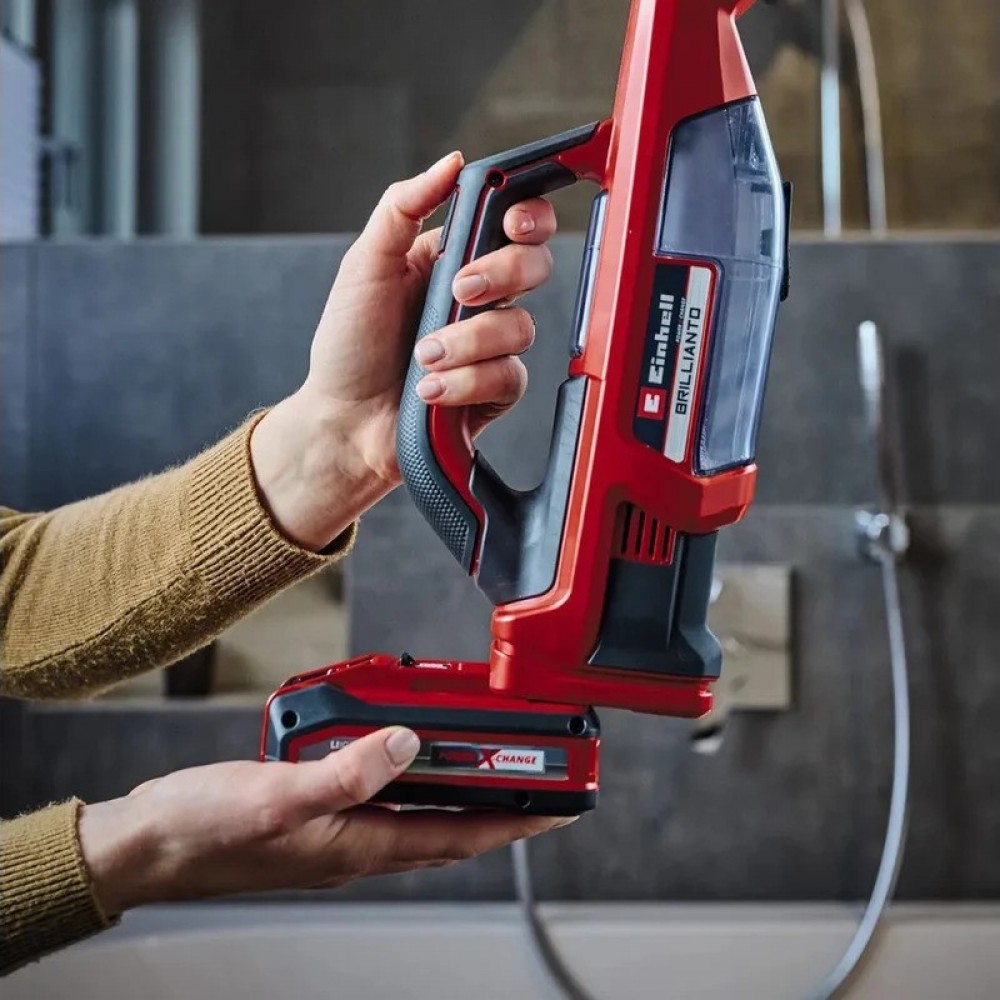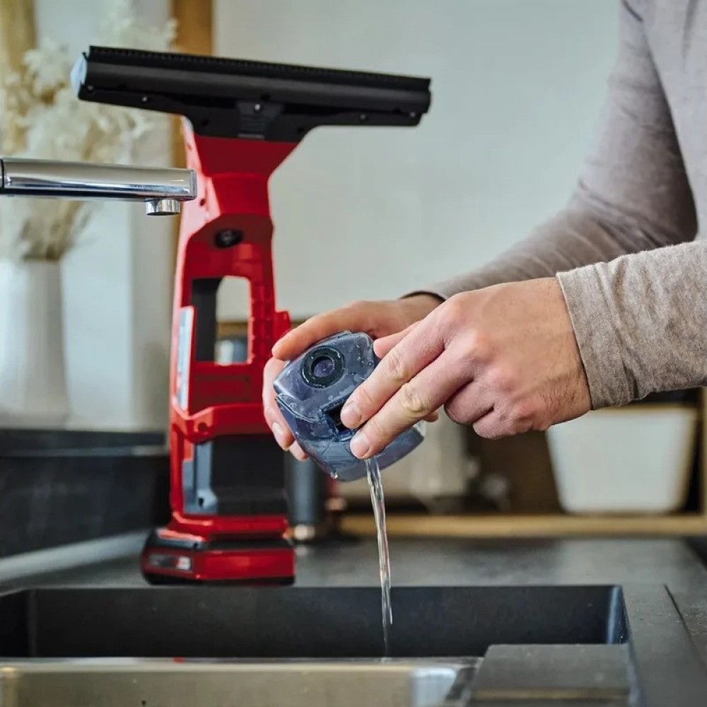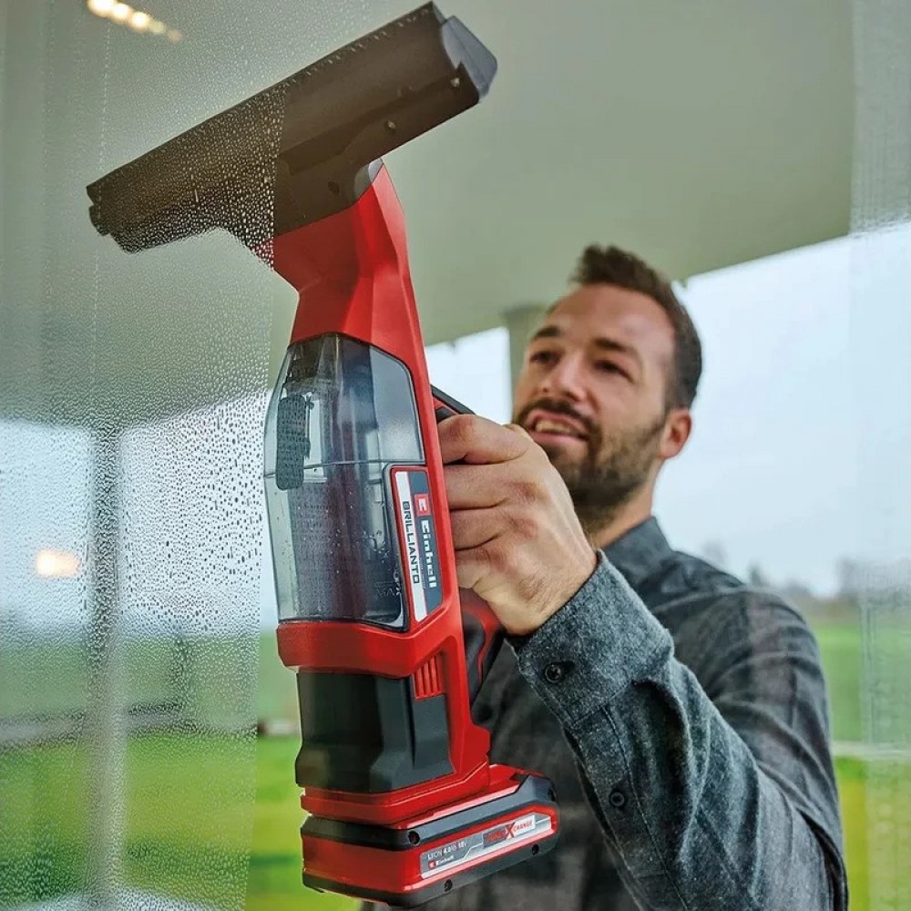 Аккумуляторный мойщик окон Einhell PXC BRILLIANTO чистые окна без разводов - для аккумуляторного стеклоочистителя BRILLIANTO от Einhell это совсем не трудно. Являясь частью семейства Power X-Change, он может сочетаться с любыми аккумуляторами и зарядными устройствами.В комплект поставки очистителя окон входит флакон с распылителем объемом 300 мл и микрофибровый коврик. Всасывающая насадка и цельная губка из силиконовой резины, обеспечивают отсутствие разводов при мытье стекол. Резервуар для грязной воды, объемом 100 мл, может быть полностью извлечен из устройства для чистки и слива. Аккумуляторный стеклоочиститель хранится в настенном кронштейне, входящем в комплект поставки, и занимает мало места.