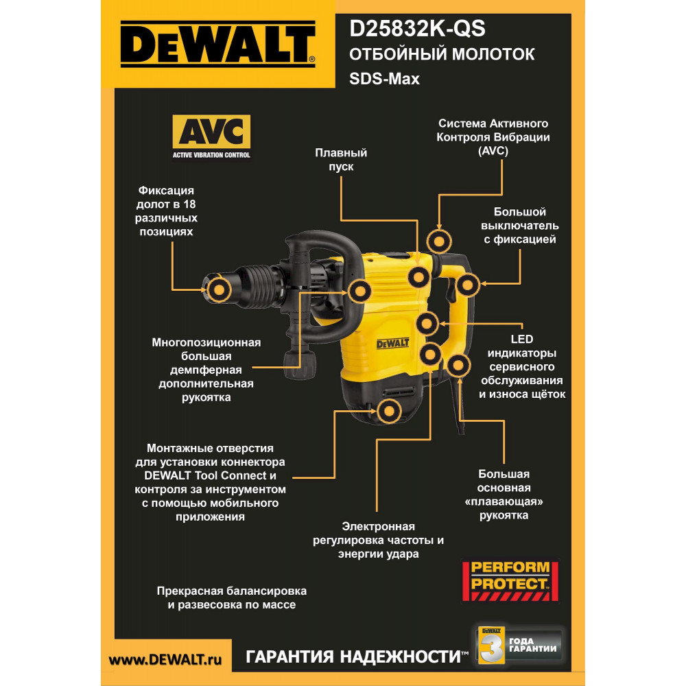 Отбойный молоток D25831K-QS SDS-max от DEWALT. Главное достоинство инструмента – цепная передача в сочетании с редуктором в масляной ванне. Увеличивают уровень комфорта во время работы, противодействуют поломкам и упрощают контроль над инструментом эргономичная компактная конструкция и хорошая развесовка. Имеется электронная регулировка частоты и энергии удара для работы с разными материалами. Чтобы удобнее было работать под любым углом в ограниченном пространстве предусмотрена установка долота в 18 различных положениях. Пользователи отбойного молотка D25831K-QS отмечают уникальную систему уплотнений для защиты от попадания пыли в ударный механизм, которая в свою очередь обеспечивает высокую производительность и долгий срок эксплуатации инструмента.