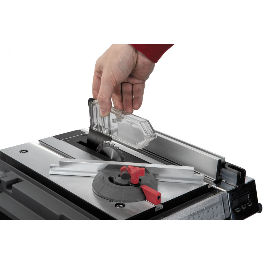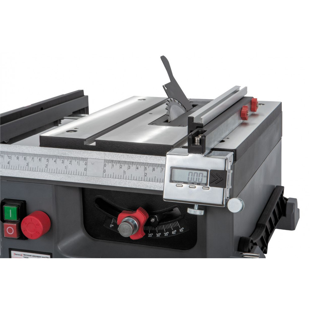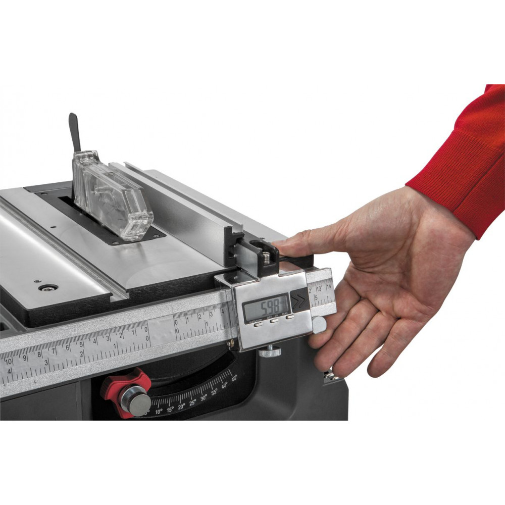 В наборе с пилой имеется параллельный упор с устройством цифровой индикации (УЦИ). Оно обеспечивает произведение отсчета перемещения упора от выбранного положения (например, от плоскости диска) в миллиметрах или дюймах. Небольшие правки специальным микрометрическим винтом можно внести после установки упора, его фиксации и пробного пропила, не ослабляя при этом основного стопора.
