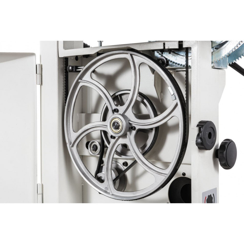 JWBS-12S – сравнительно крупная и мощная ленточная пила для любительской работы с заготовками высотой до 170 мм. Модель оборудована большим чугунным столом и двухскоростной ременной передачей: высшая ступень обеспечивает высокую производительность по неплотным породам, низшая для твердой древесины, склонной к образованию прижогов.