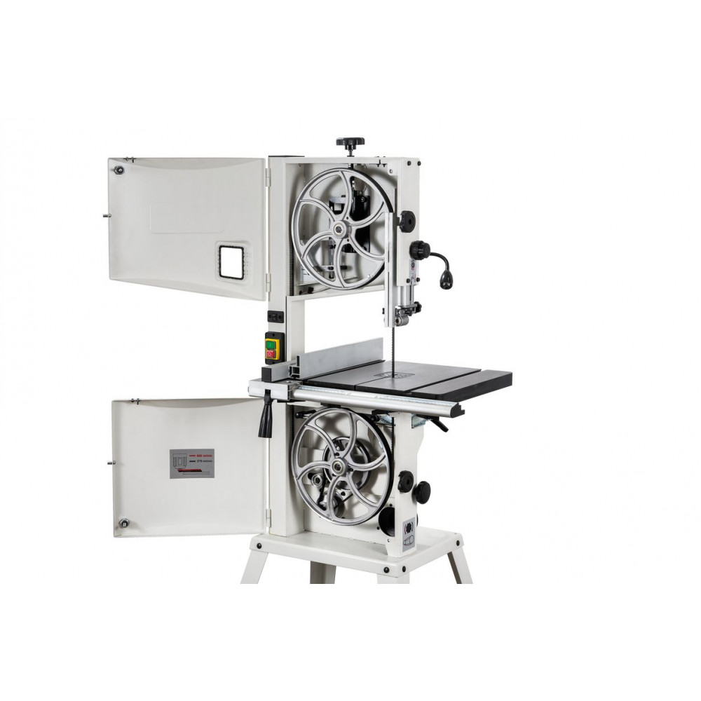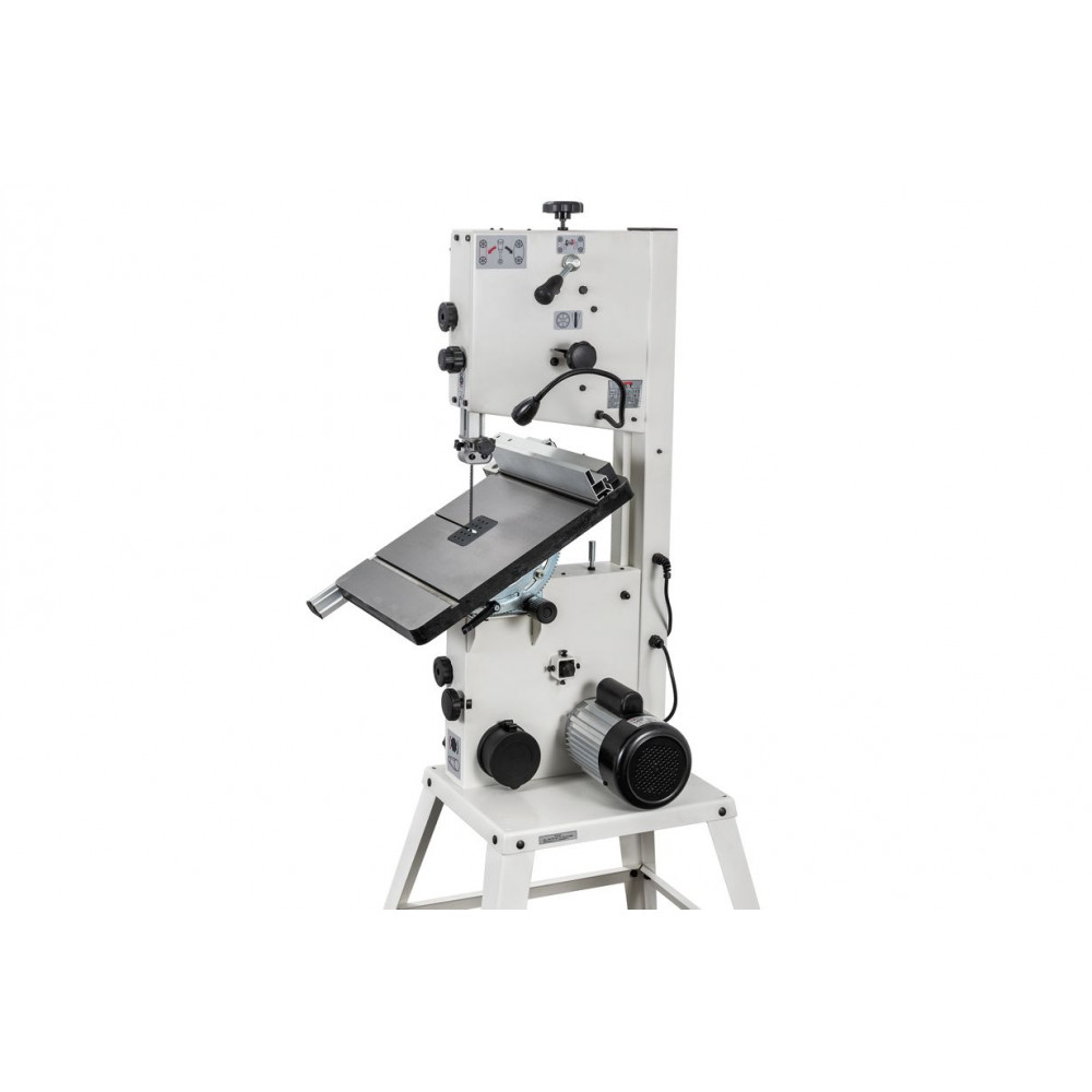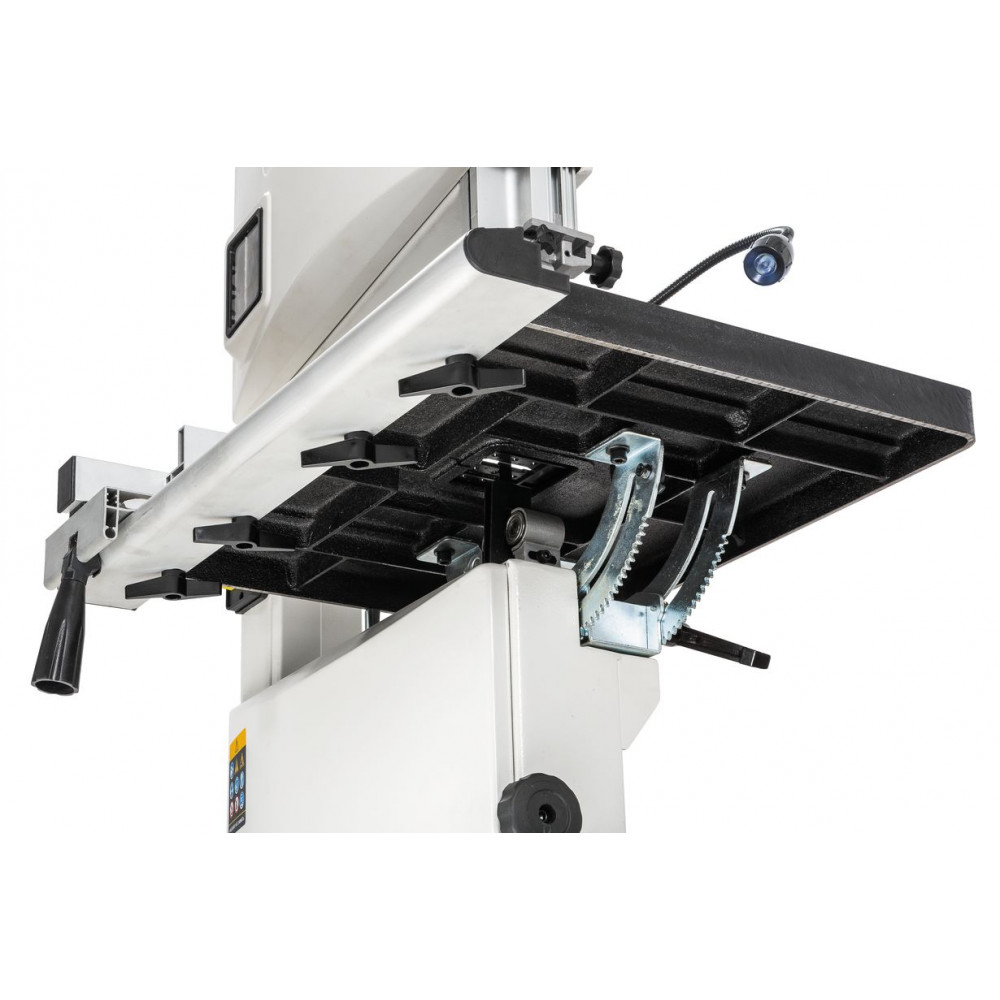 Данная модель имеет максимальное для своего класса оснащение и, кроме привычных «обязательных» функций и настроек, у нее есть и все вспомогательные. Среди них рычаг для быстрого ослабления и натяжения полотна, позволяющий одним движением переводить станок из состояния хранения в рабочее. Светодиодная подсветка рабочей области с гибким штативом. Патрубок аспирации со ступенчатым подключением шланга диаметром 50, 75 или 100 мм. Опорная подставка, которая может быть снята в случае настольного размещения.