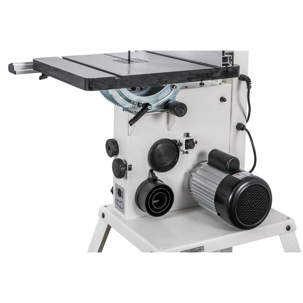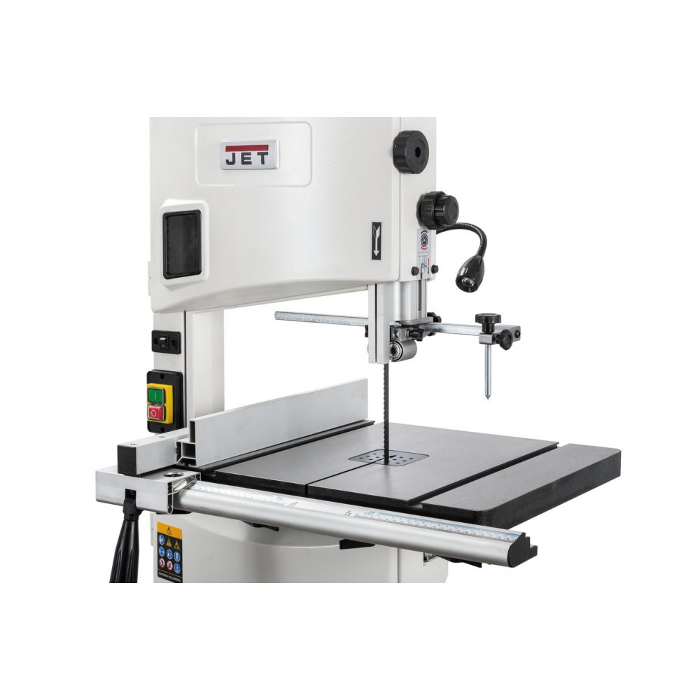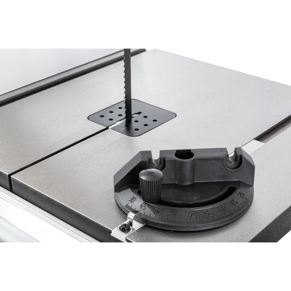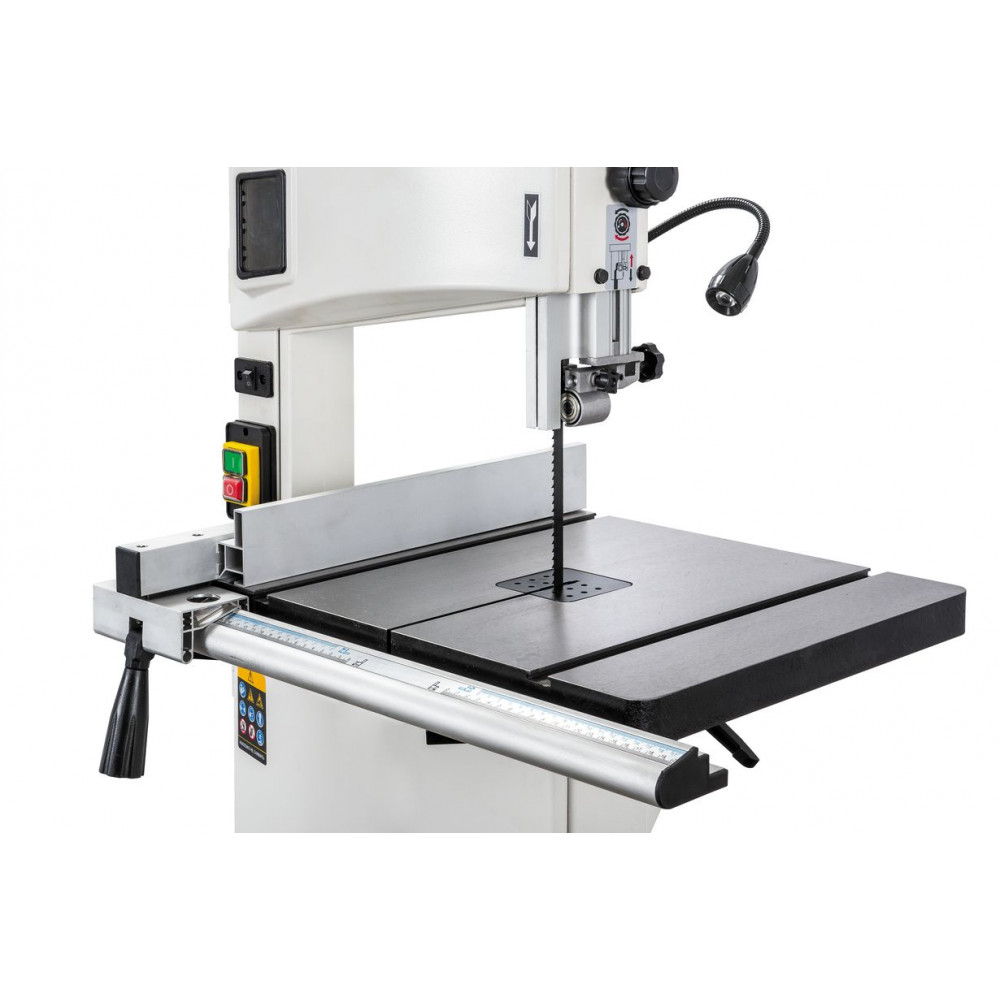 Данная модель имеет максимальное для своего класса оснащение и, кроме привычных «обязательных» функций и настроек, у нее есть и все вспомогательные. Среди них рычаг для быстрого ослабления и натяжения полотна, позволяющий одним движением переводить станок из состояния хранения в рабочее. Светодиодная подсветка рабочей области с гибким штативом. Патрубок аспирации со ступенчатым подключением шланга диаметром 50, 75 или 100 мм. Опорная подставка, которая может быть снята в случае настольного размещения.