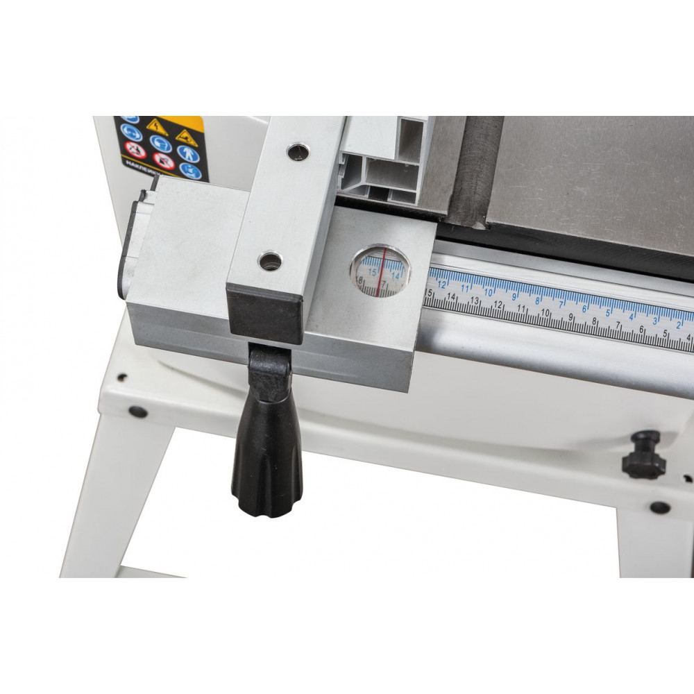 Параллельный упор двухпозиционный: имеет высокую сторону для надежной поддержки высоких заготовок при резе перпендикулярно столу и низкую, для плоских деталей и для пиления с наклоном. Фиксация упора эксцентриковая, на направляющем профиле миллиметровая разметка, на корпусе увеличительное стекло с риской.