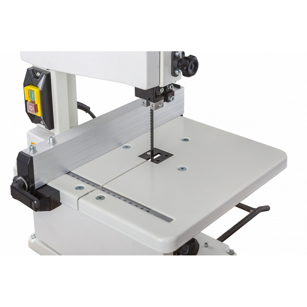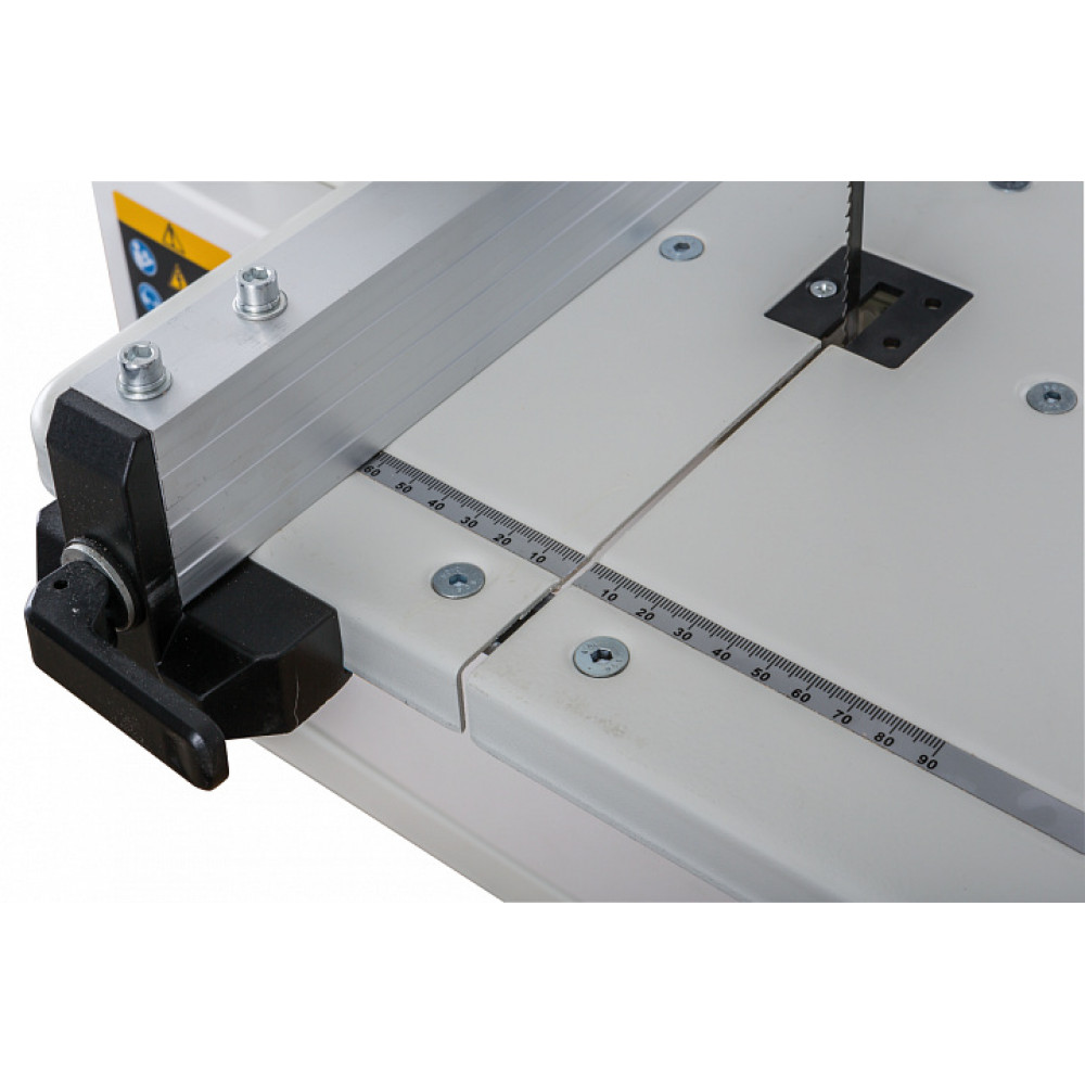 Если лента износилась или возникла необходимость сменить, ее торцы регулируют, сдвигая вдоль оси и зажимая винтами с шестигранником. Продольную опору обеспечивает ролик с шарикоподшипником. В зависимости от толщины заготовки весь верхний узел опускается и поднимается. Нижний узел устроен аналогично, он неподвижно закреплен под рабочим столом. В комплект станка входит параллельный упор, предусмотренный для распиловки по прямой. Он закрепляется на отбортовке стола и перемещается вдоль края влево и вправо. Миллиметровая шкала с началом отсчета в плоскости реза предусмотрена для удобства настройки.