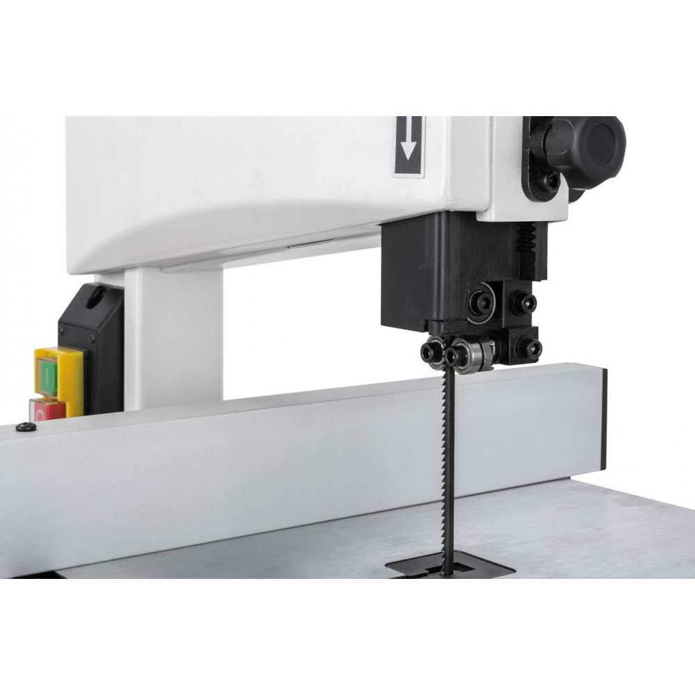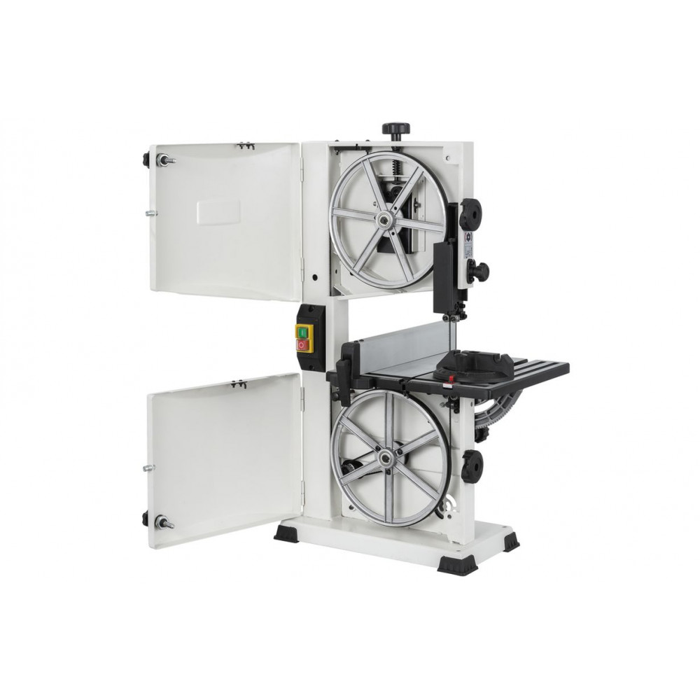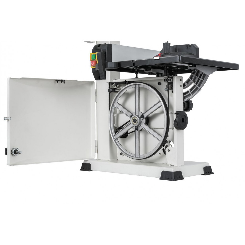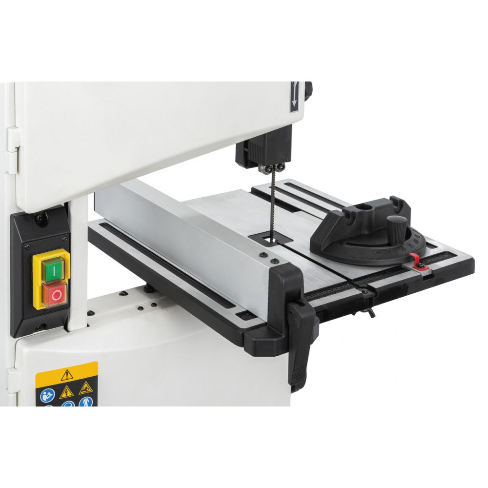 JWBS-9S – настольный ленточнопильный станок для частного любительского применения. Позволяет распускать заготовки толщиной до 90 и шириной до 225 мм. Укомплектован трехроликовыми направляющими с шарикоподшипниками, обеспечивающими легкое движение ленты, минимальный износ и простоту регулировки. Ведущий шкив приводится во вращение через зубчато-ременную передачу, а не установлен непосредственно на валу двигателя, как часто делают для упрощения конструкции. Такая разнесенная схема дает более плавное без биений вращение и лучшую ремонтопригодность.
