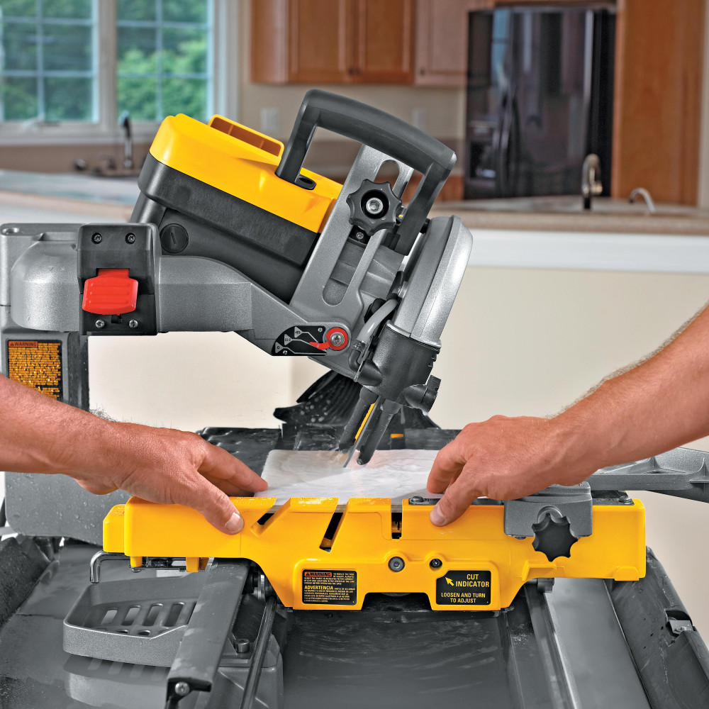 КОМПЛЕКТАЦИЯ: отрезной алмазный диск DT3734, дополнительный стол, боковой и задний коллекторы воды, шестигранный ключ.