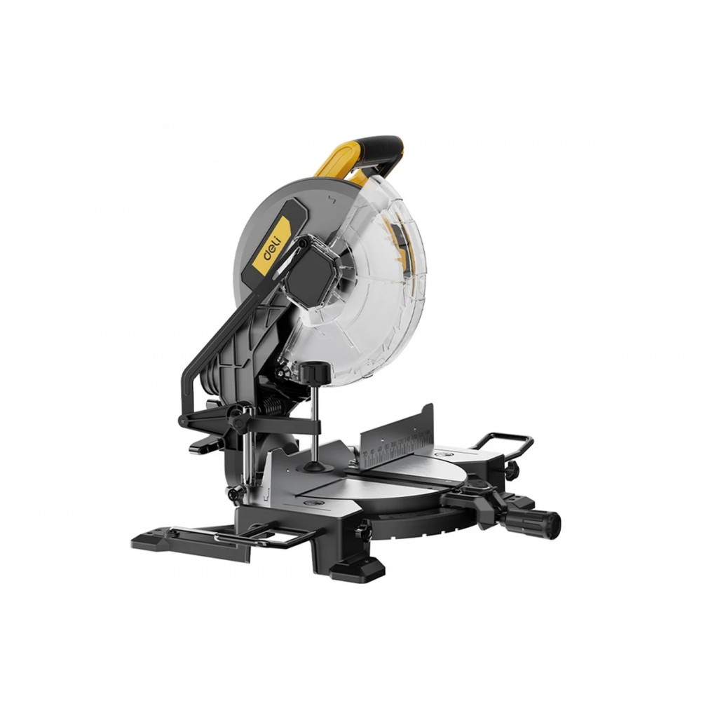 Торцовочная пила Deli DC574 (1800 Вт, 5000 об/мин) с диском 255 мм (30 мм посадочное отверстие, 40 зубьев). Углы распила: прямой (90°) — 65×140 мм, косой (45°) — 65×95 мм, комбинированный — 38×95 мм. Минимальный размер заготовки: 90×5×5 мм. Оснащена поворотной платформой (до 47°), наклоном пильного узла (до 45° влево), прорезиненной рукояткой, защитным кожухом, электронной защитой от перегрузок и фиксатором заготовки.