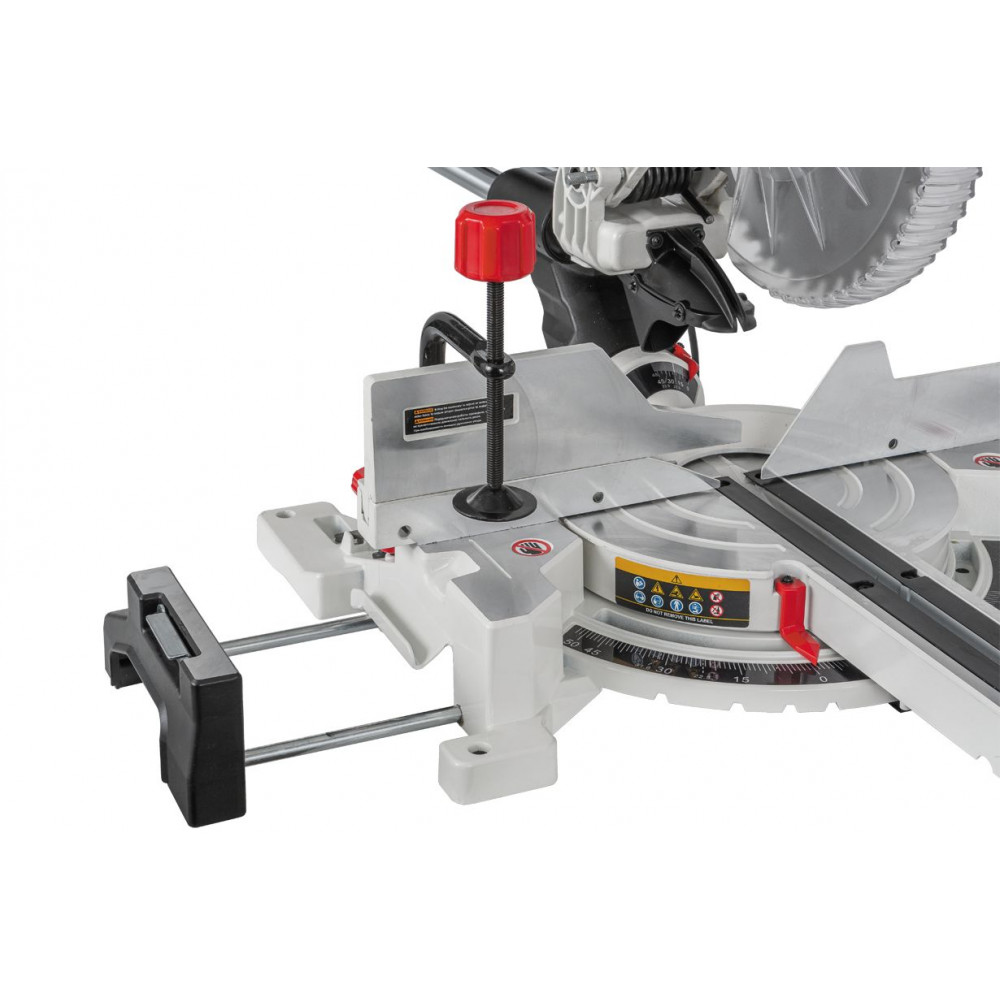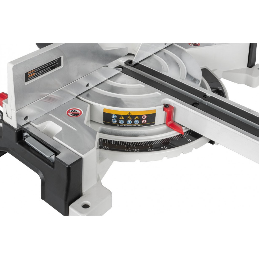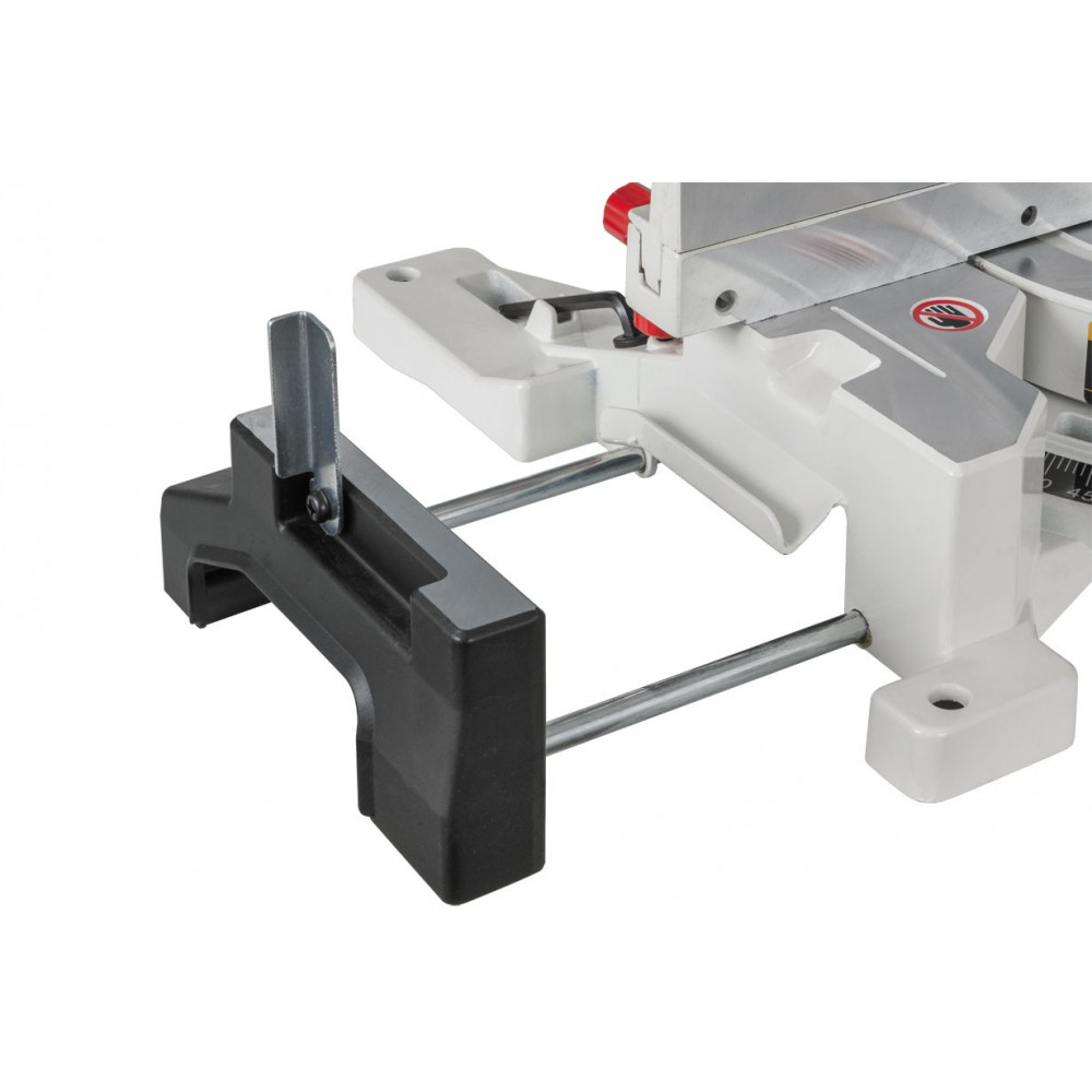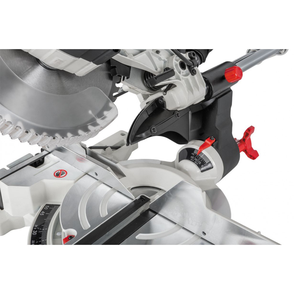 Рабочий стол из алюминиевого литья оборудован дополнительной регулируемой опорой и светодиодной подсветкой для удобства работы. Помимо этого, пила оснащена направляющими для продольной подачи, механизмом блокировки вала для легкой замены пильного диска, регулировкой наклона и поворота пильного диска, стопором типовых углов поворота с кнопкой отключения, регулируемым ограничителем глубины пропила, съемными и раздвижными расширителями рабочего стола, двумя откидными регулируемыми концевыми упорами заготовки, прижимом заготовки и удобной рукояткой для переноски.