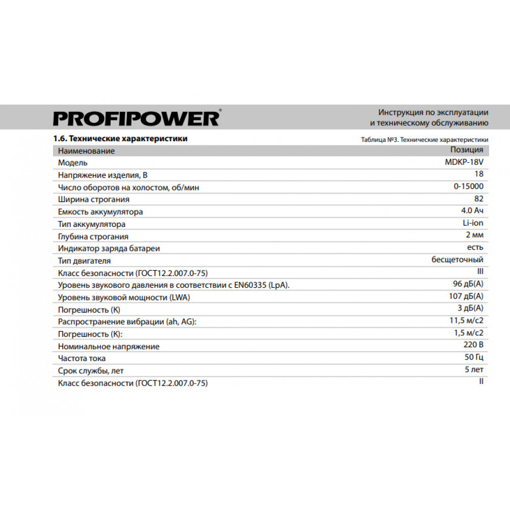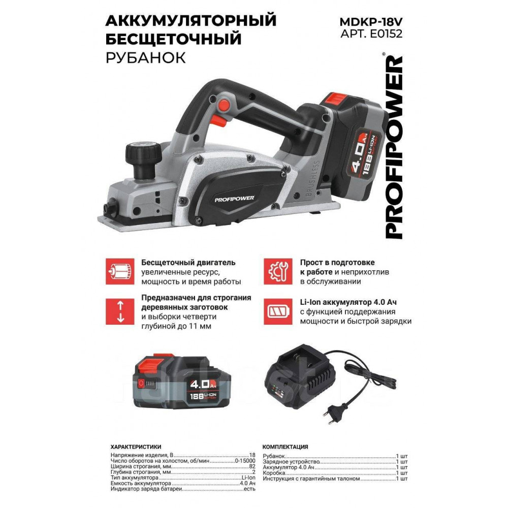 Рубанок E0152 Аккумуляторный бесщеточный MDKP-18V (Li-ion-1шт, 4.0Ач, З/У, в коробке) Profipower