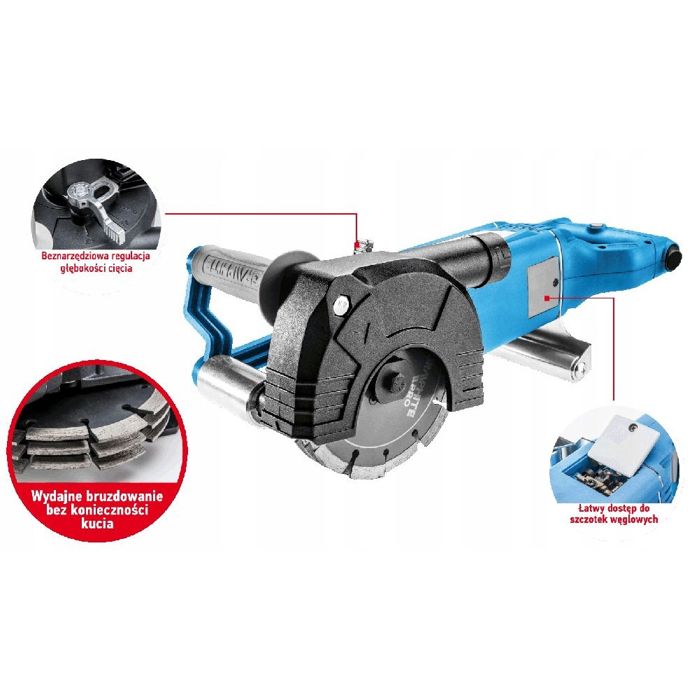 Эргономичный дизайн и ручки обеспечивают максимальное удобство во время эксплуатации. Специальная конструкция отрезного диска позволяет эффективно бороздить борозды без ковки. Результат однократного пропила - готовая борозда шириной 30 мм и глубиной 43 мм. Скорость вращения - 8000 оборотов в минуту. В устройстве есть система плавного пуска.