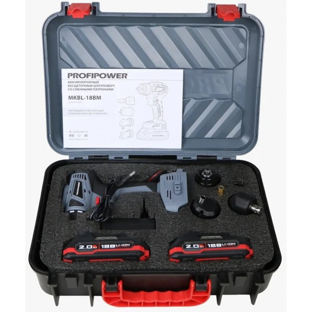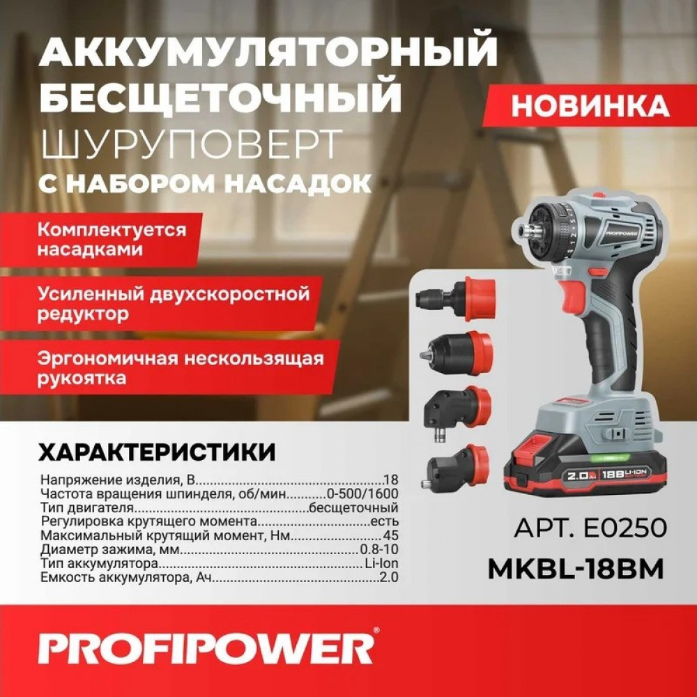 Шуруповёрт E0250 бесщеточный со сменными насадками MKBL-18BM (18В, 45 Нм, 2.0 Ач) Profipower