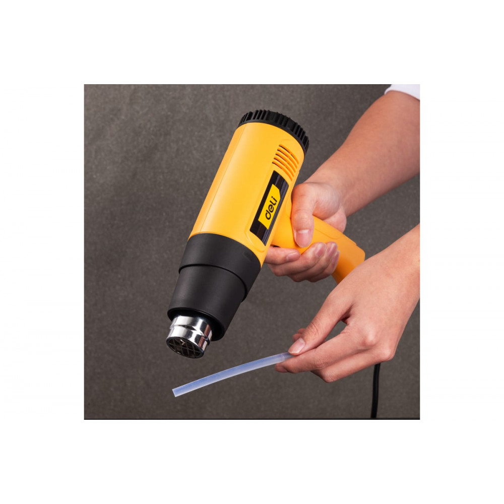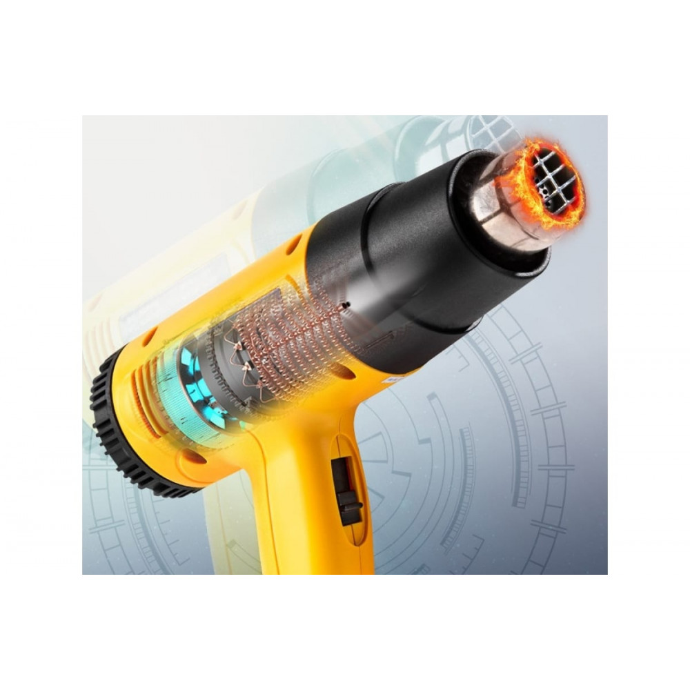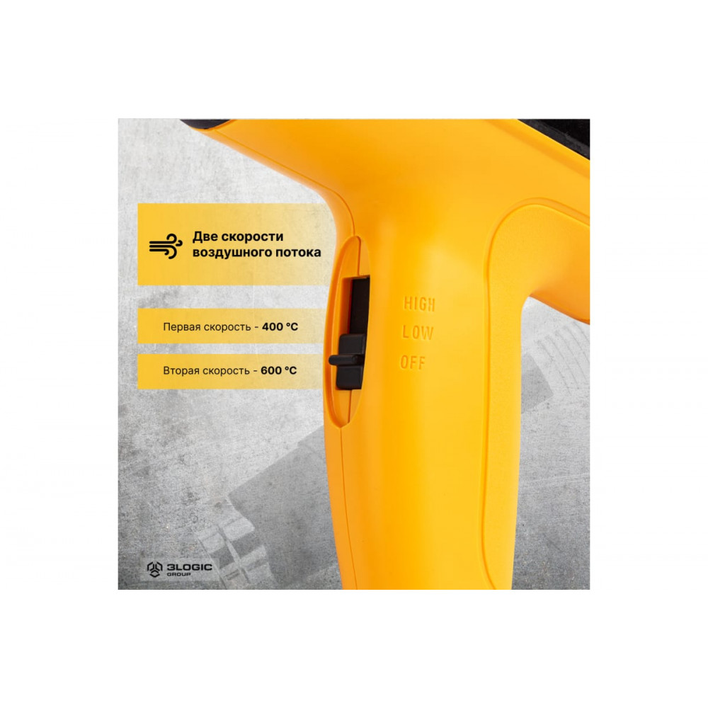 Корпус изготовлен из ABS-пластика, который хорошо изолирует тепло. Воздухозаборник эффективно охлаждает двигатель и предотвращает перегрев. На ручке установлен удобный ползунковый переключатель скоростей. Термофен имеет металлическую скобу для подвесного хранения, чтобы горячее сопло не соприкасалось с рабочим столом.