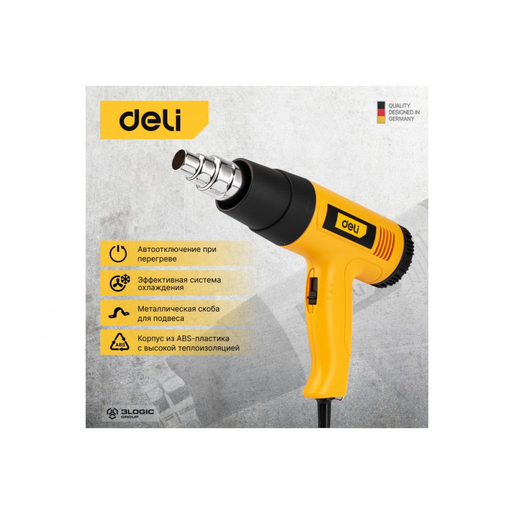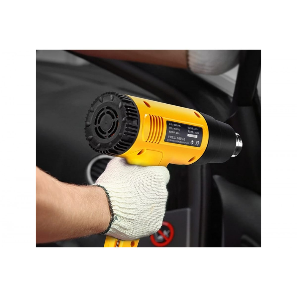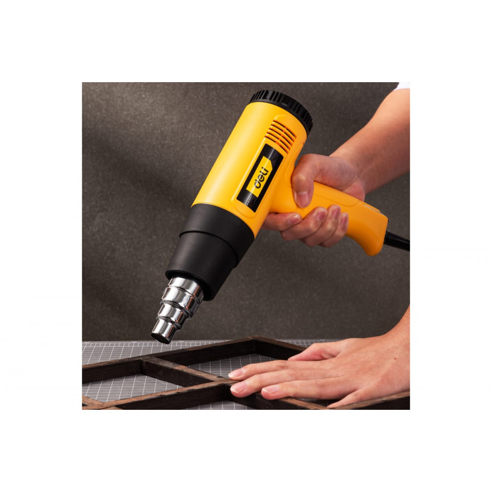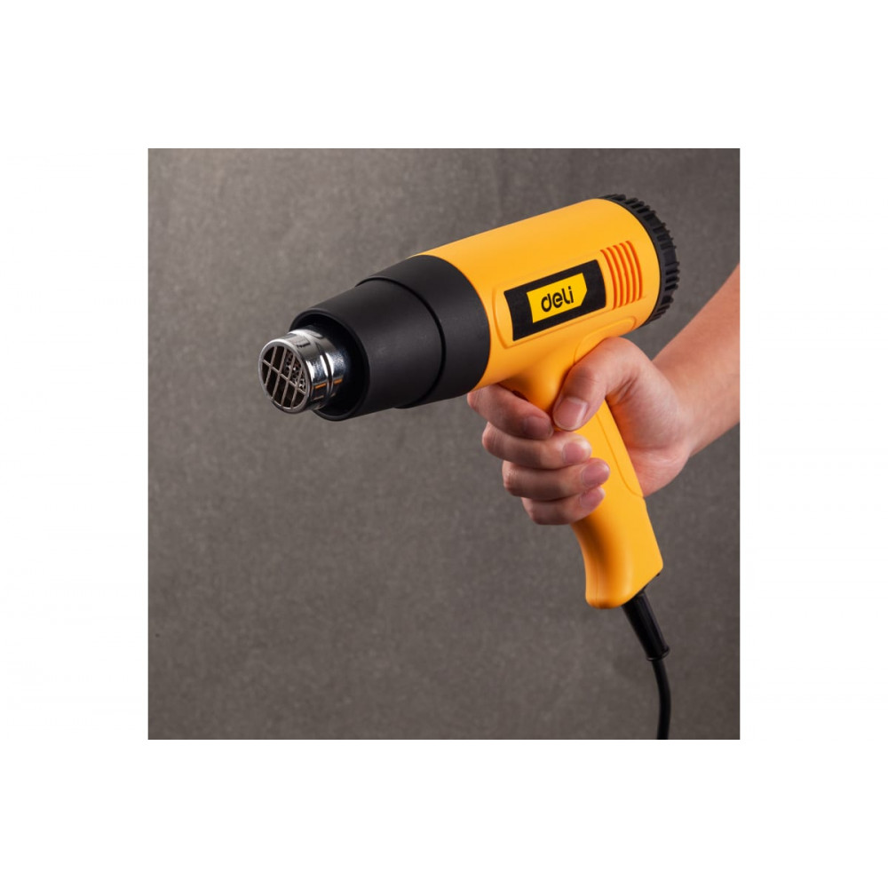 Корпус изготовлен из ABS-пластика, который хорошо изолирует тепло. Воздухозаборник эффективно охлаждает двигатель и предотвращает перегрев. На ручке установлен удобный ползунковый переключатель скоростей. Термофен имеет металлическую скобу для подвесного хранения, чтобы горячее сопло не соприкасалось с рабочим столом.