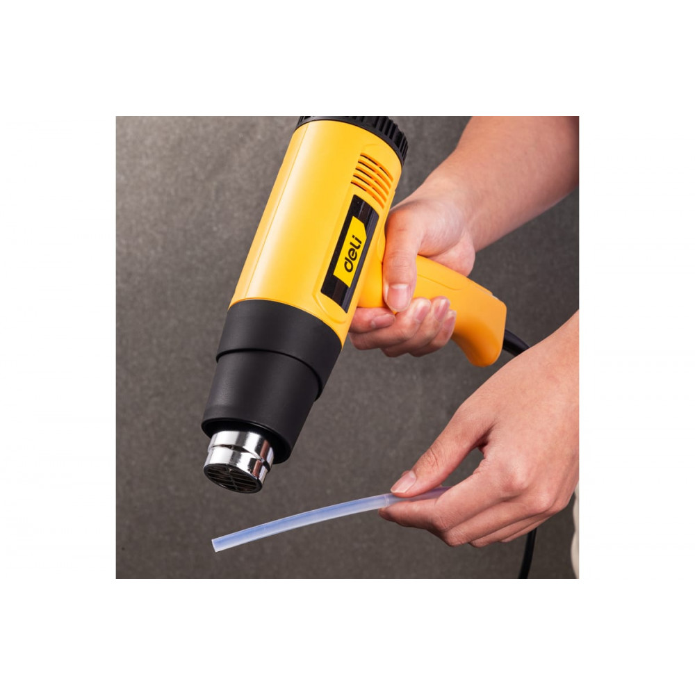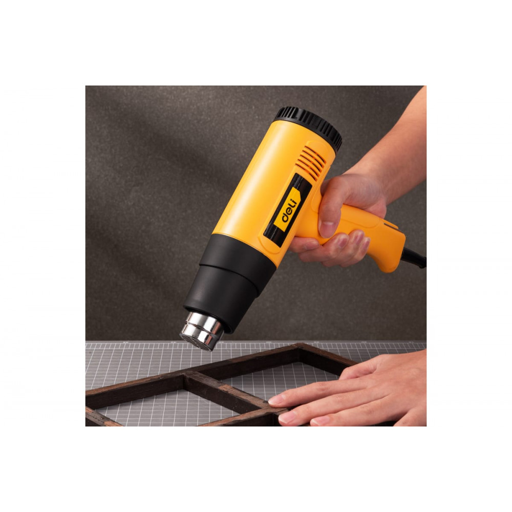 Термопистолет DL391202 от TM DELI - это универсальный инструмент, который можно применять для разных целей, таких как сушка, разогрев, обеззараживание, отделка и ремонт. Данная модель термопистолета имеет удобную функцию бесступенчатой регулировки температуры воздуха с помощью поворотного колеса на задней стороне корпуса. Это позволяет подобрать оптимальный режим работы для разных видов материалов.