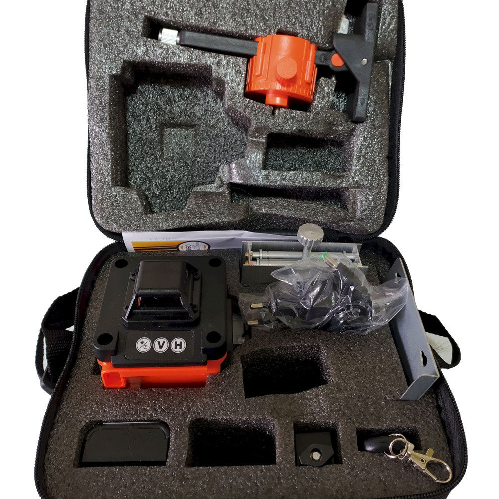 КОМПЛЕКТАЦИЯ: лазерный нивелир, кейс, 2 АКБ Li-ion, зарядное устройство для аккумуляторного блока, настенный кронштейн, инструкция.
