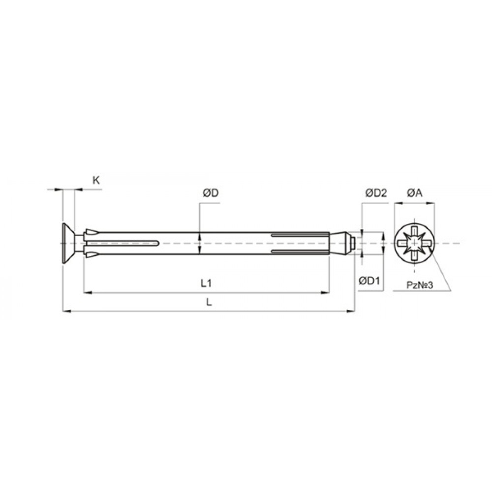 Особенности конструкции: анкер состоит из стальной разрезанной втулки, винта со шлицем PZ 3 и конусной гайки. Конструкция анкера выполнена таким образом, что расклинивание и фиксация его происходит сначала в основании, затем в прикрепляемом материале.