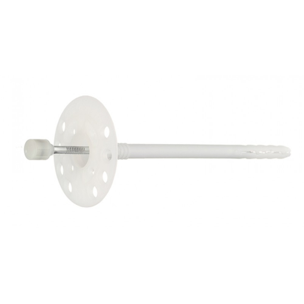 Дюбель для теплоизоляции с металлическим гвоздем предназначен для крепления термоизоляционных материалов к полнотелым основаниям – бетону, кирпичной кладке, природному строительному камню. Используется для монтажа на стенах, особо подверженных неблагоприятным воздействиям атмосферных условий. Дюбель изготовлен из полипропилена. В комплекте с дюбелем поставляется металлический оцинкованный гвоздь с термоколпачком, предотвращающий образование «мостика холода» и коррозии гвоздя, тем самым улучшая теплоизоляцию. Конструкция широкой шляпки дюбеля плотно прижимает теплоизоляцию, отверстия позволяют утопить дюбель в клее без потери эластичности шляпки.