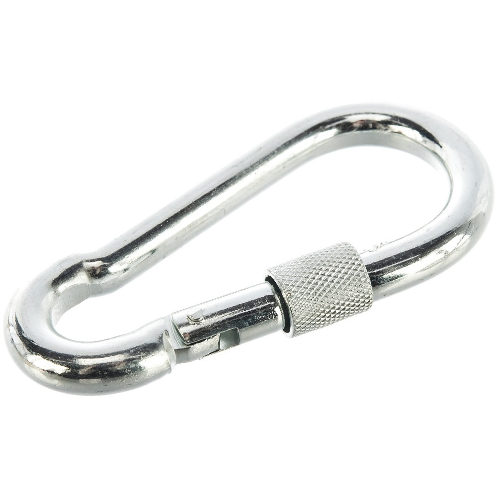 Особенности конструкции: карабин с грушевидной формой и широкой нижней частью. Такая форма позволяет использовать данное изделие с одновременным креплением двух цепей или тросов к нижней части карабина. Карабин оснащен пружинным фиксатором, который удерживает карабин в закрытом состоянии. Защелка открывается простым нажатием пальца. Размером карабина считается диаметр поперечного сечения.
