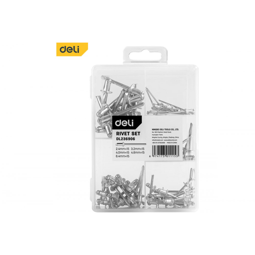 Набор DL236906 заклепок 75шт, Deli представляет собой комплект заклепок, состоящий из 75 штук различных размеров. В наборе присутствуют заклепки диаметром 2.4 мм, 3.2 мм, 4.0 мм, 4.8 мм и 6.0 мм в количестве по 15 штук каждого размера.Эти заклепки идеально подходят для соединения различных материалов, таких как дерево, металл, пластик и другие. Они обеспечивают надежное и прочное соединение, которое способно выдерживать значительные нагрузки.