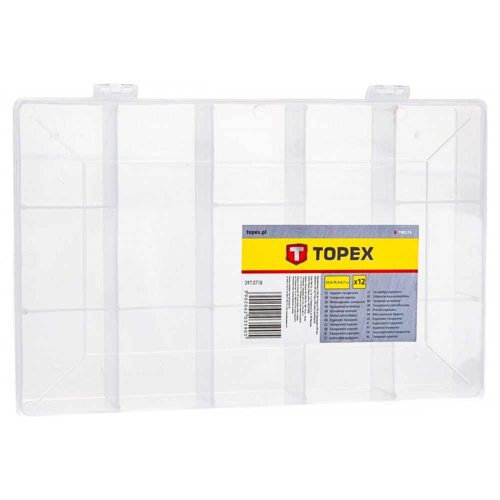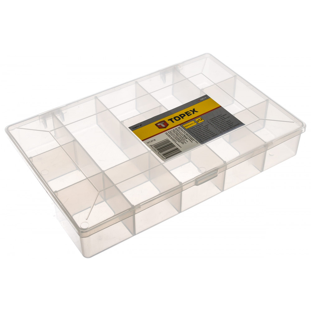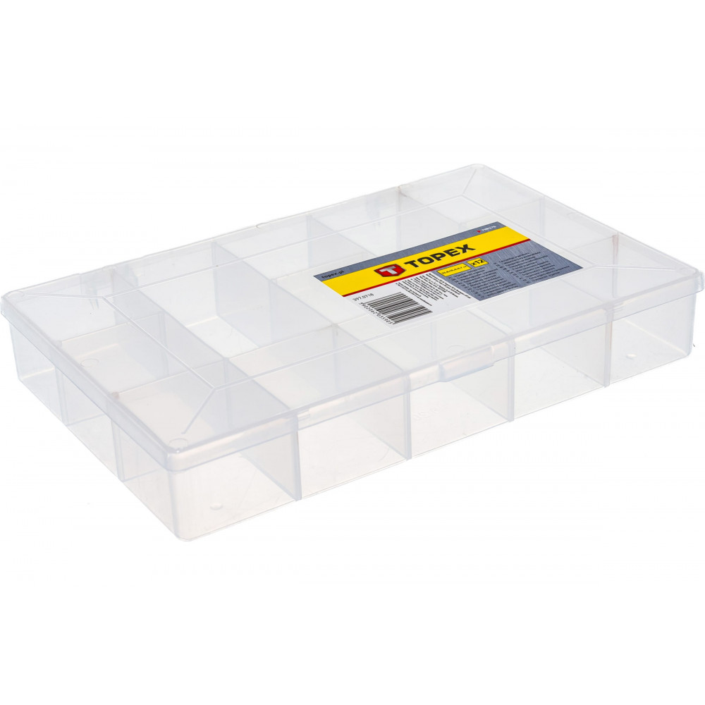 Комментарий: Несъемные разделители - достоинство для тех, кто хранит запас мелких "деталек", как я. Поскольку при съемных разделителях, несмотря на преимущество менять конфигурацию ячеек, при хранении и использованнии они приподнимаются и мелкие элементы смешиваются внизу. Отдельное спасибо "Topex" за фирменную наклейку, которую реально отклеить чисто без следов клея по всей крышке.