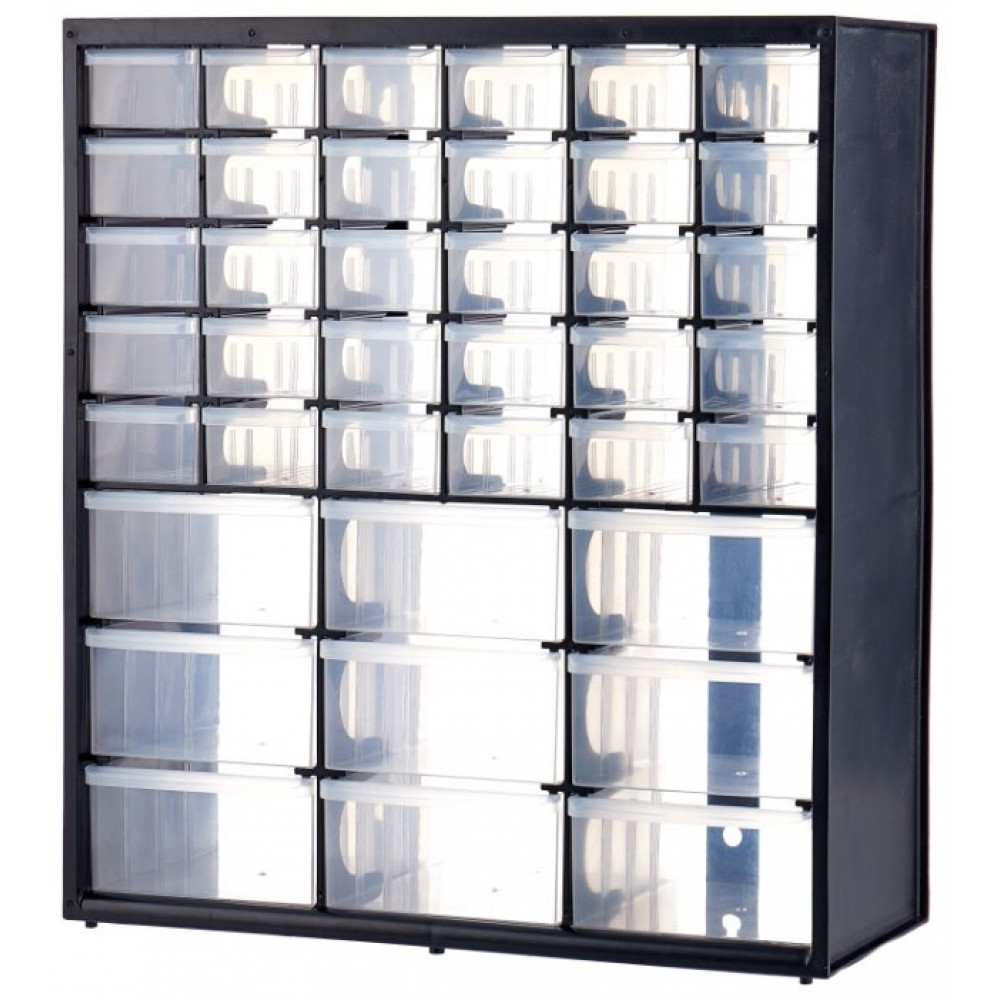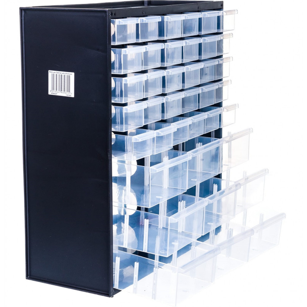 Ящик имеет 9 больших выдвижных отсеков и 30 размером меньше для более мелких деталей. Ящики органайзера изготовлены из прозрачного пластика, благодаря чему их содержимое можно легко распознать, не открывая само отделение.