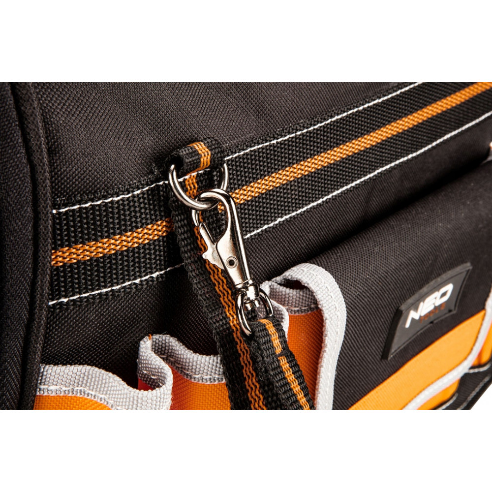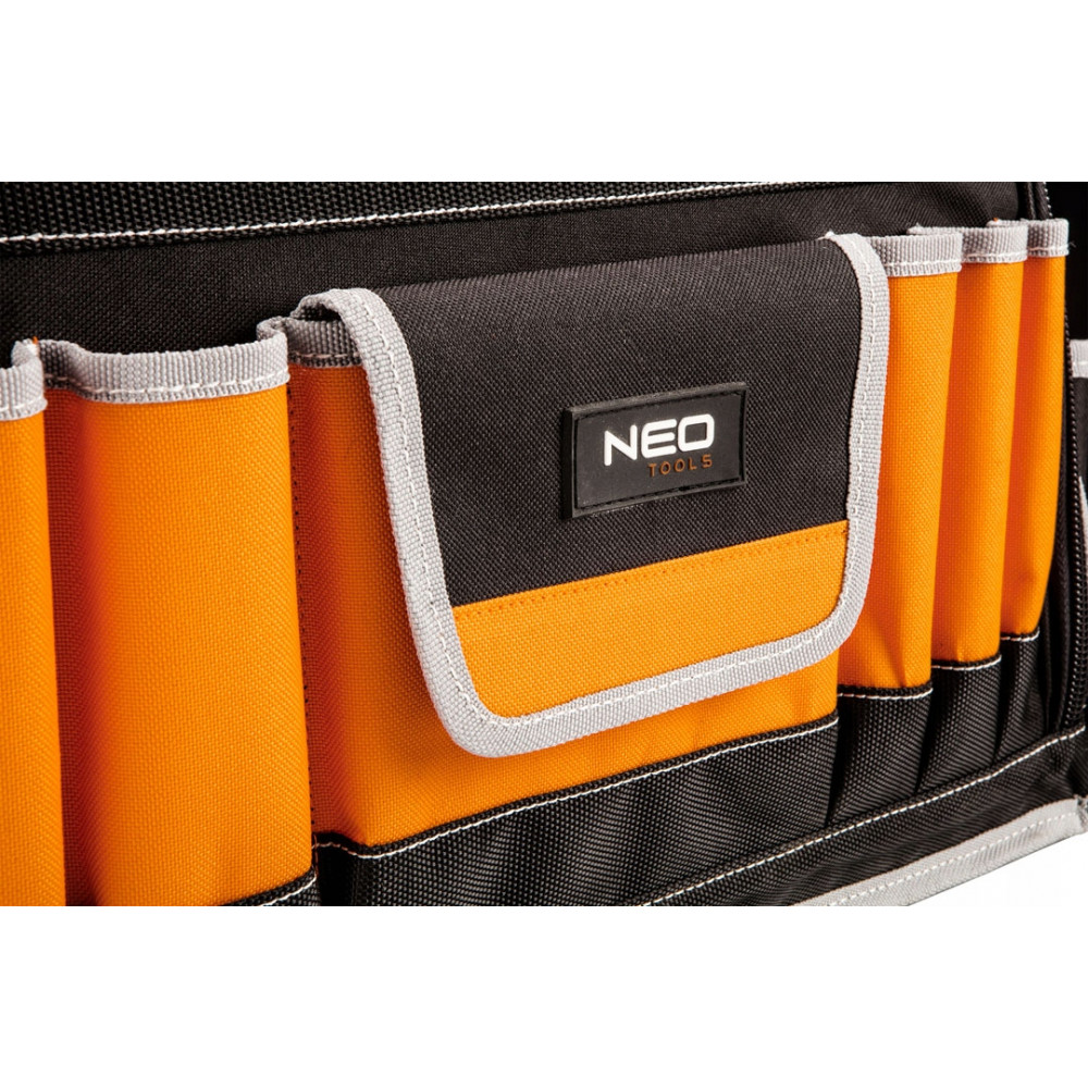 Кофр для инструмента NEO (арт. 84-301) материал - полиэстер 600 D, гарантирующий прочность на долгие годы. Дно кофра упрочнено стойками, защищающими содержимое во время работы в тяжелых условиях. Кофр с крепкой ручкой и плечевым ремнем. Отличительная особенность кофра - это большое количество карманов - 12 наружных и 32 внутренних. Бренд NEO оправдывает ожидания профессионалов.