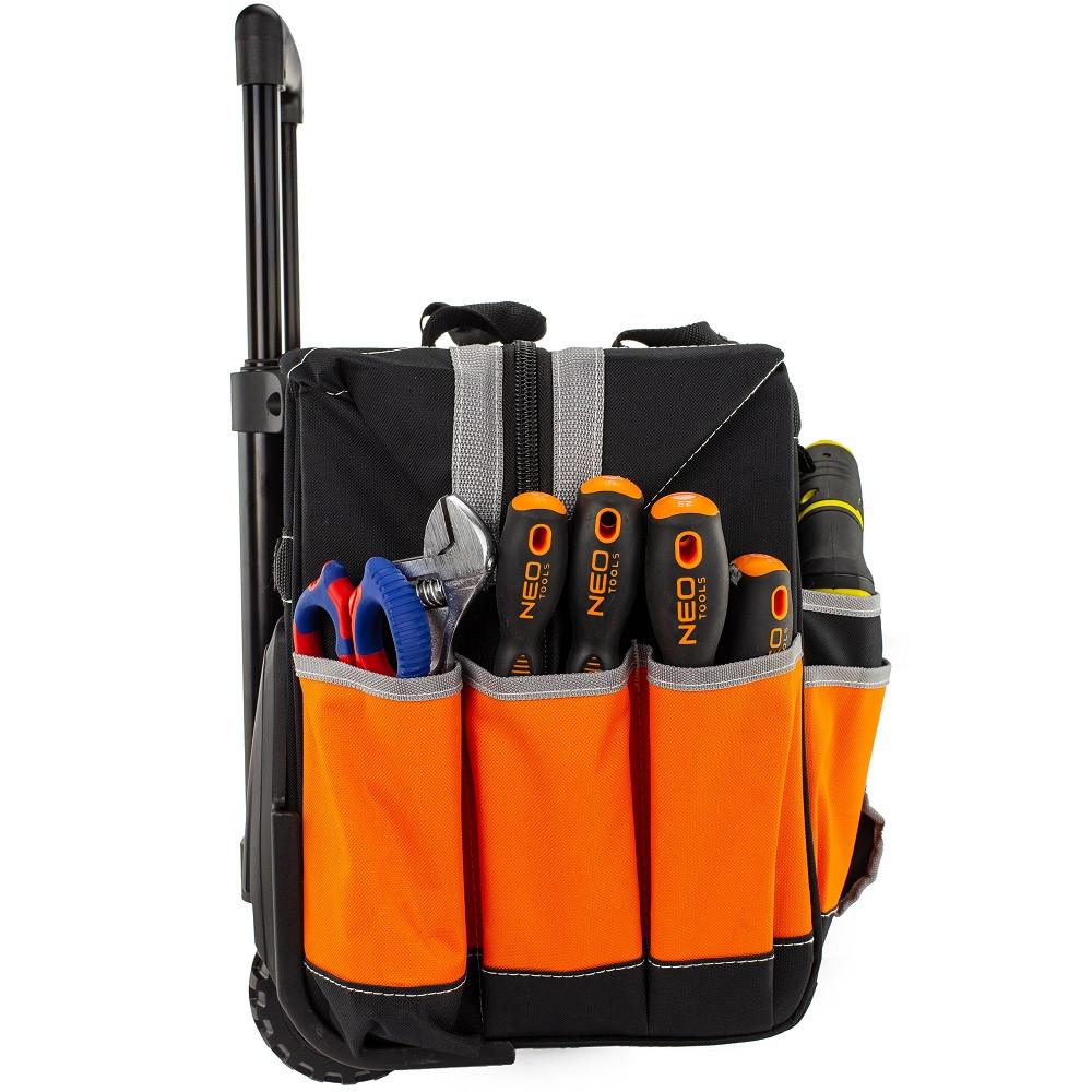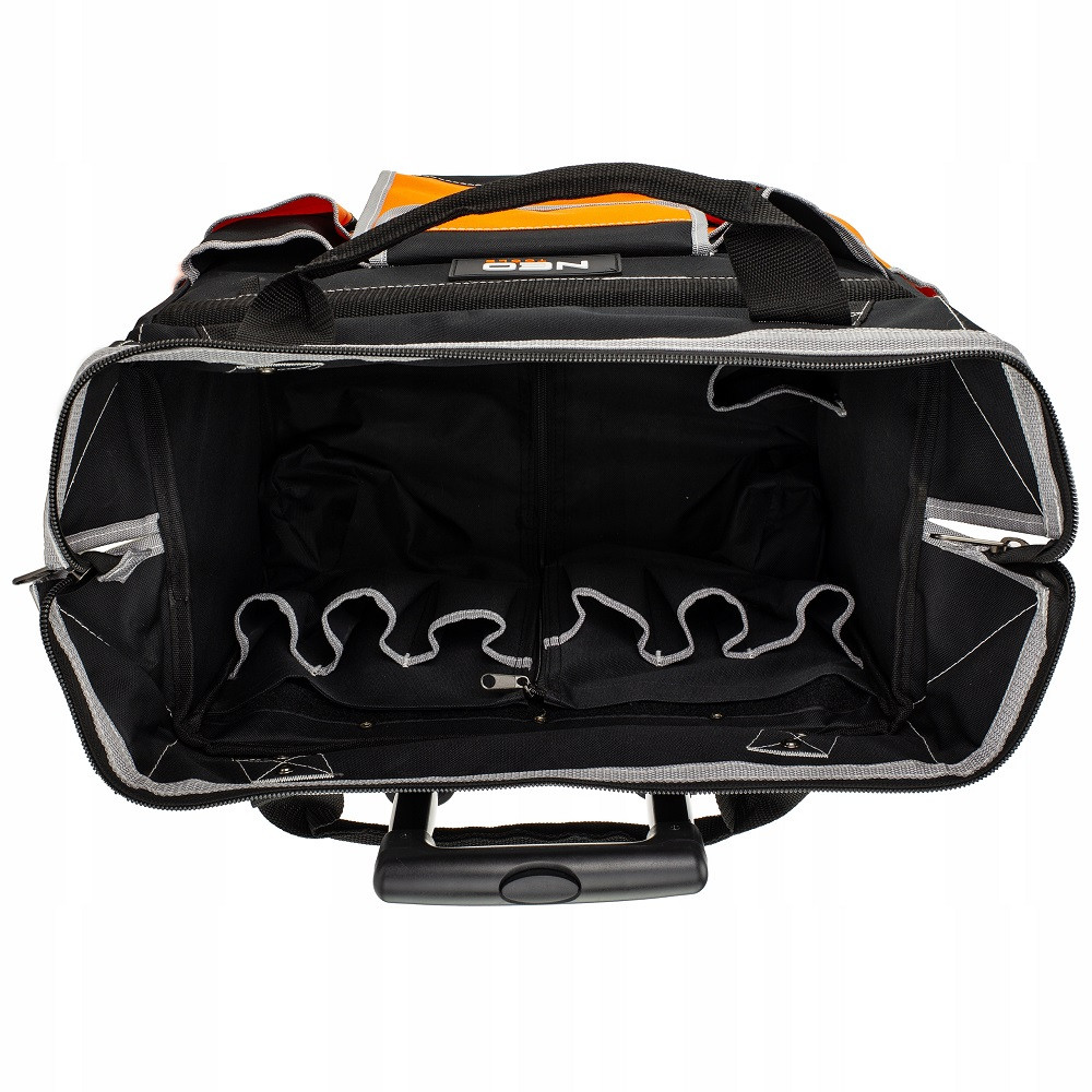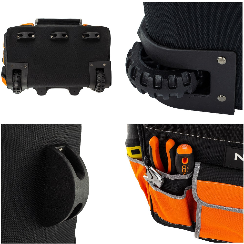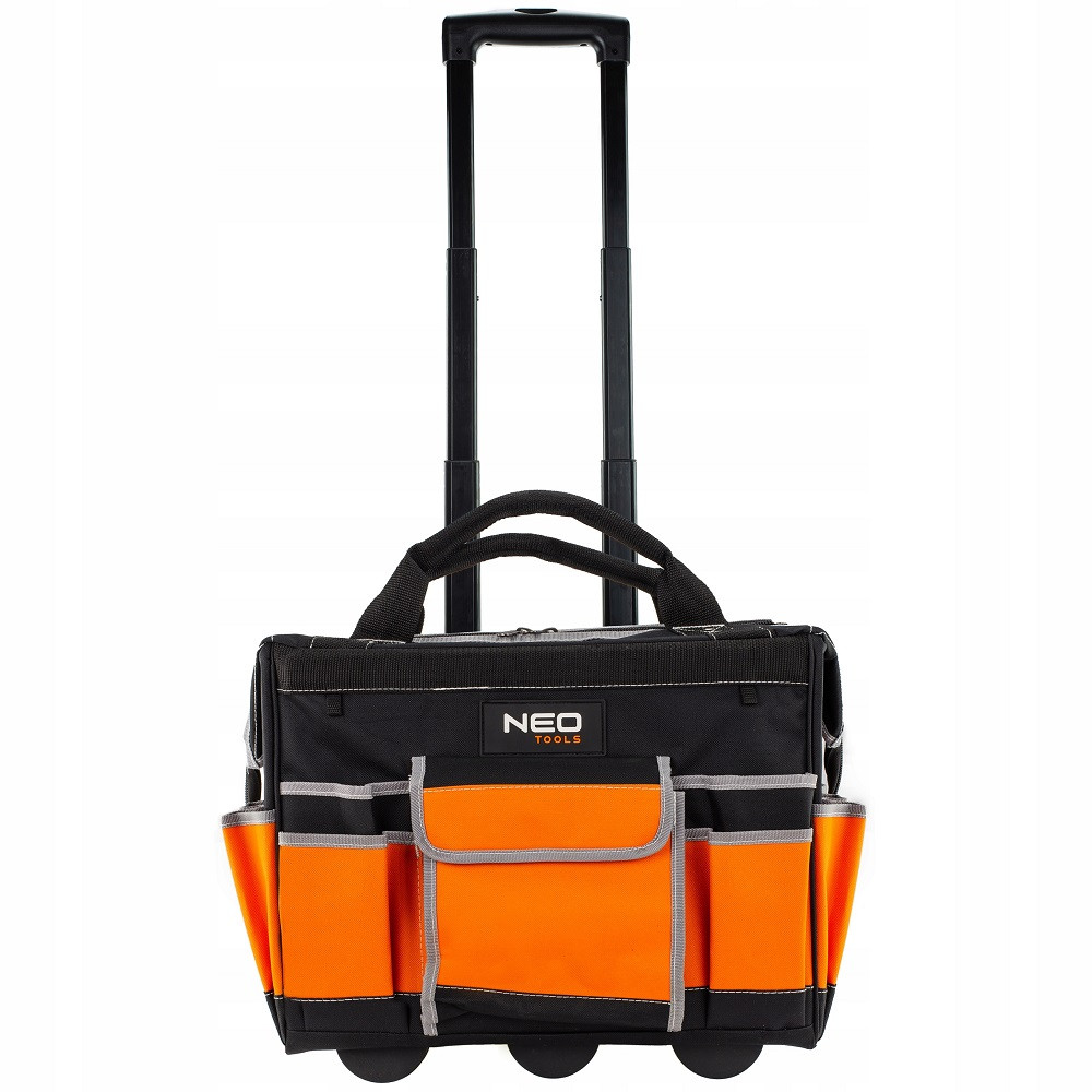 Кофр для инструмента на колесах NEO (арт. 84-302) материал - полиэстер 600 D, гарантирующий прочность на долгие годы. Конструкция, швы и замки усилены. Телескопическая ручка с блокиратором и крепкие колеса облегчают транспортировку тяжелого инструмента. Кофр с крепкой ручкой, усиленной заклепками. 11 внутренних карманов и 6 наружных вместе с большим основным отделом обеспечат хранение и транспортировку большого количества инструментов.