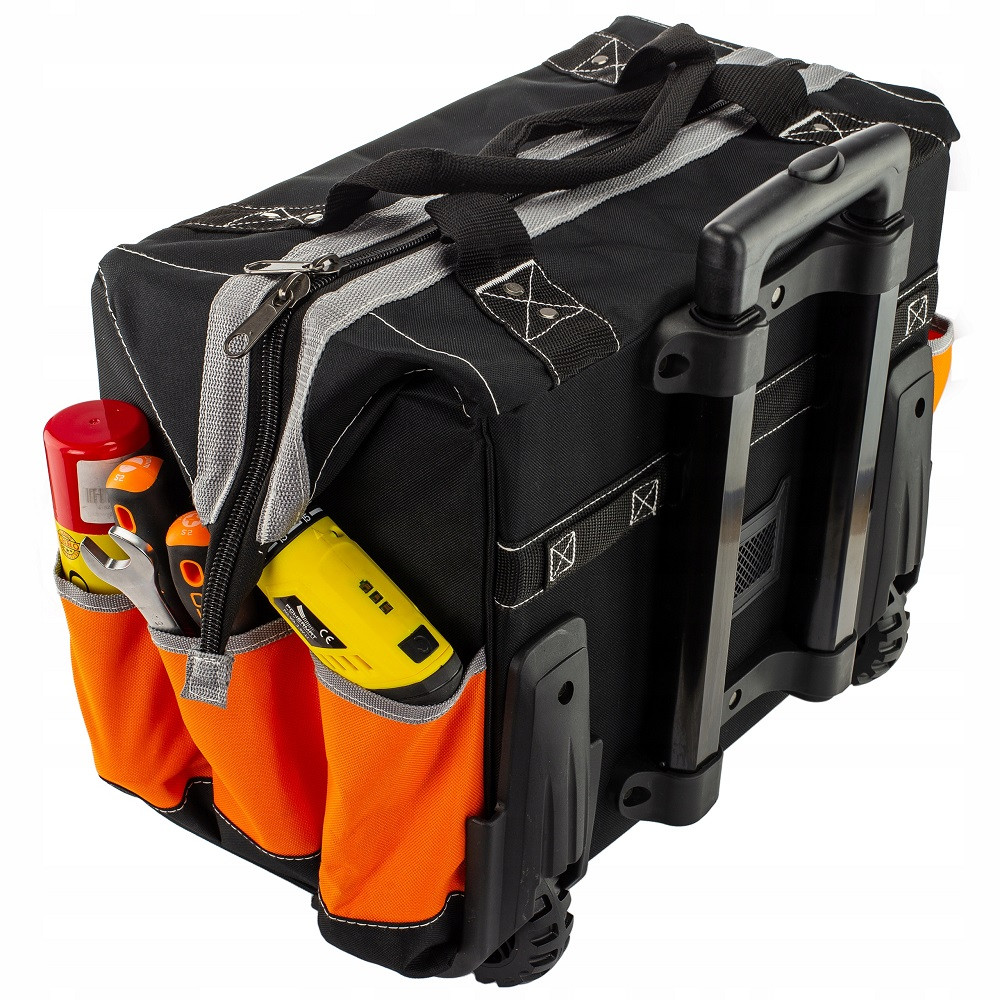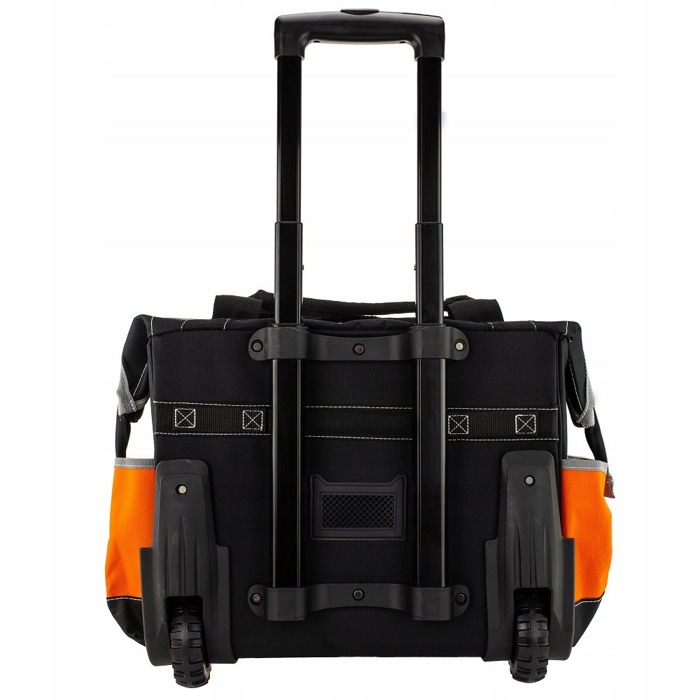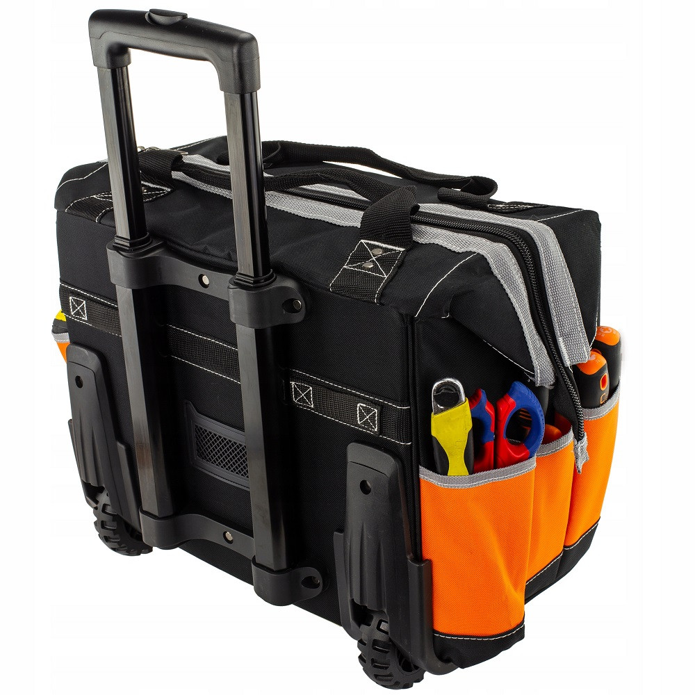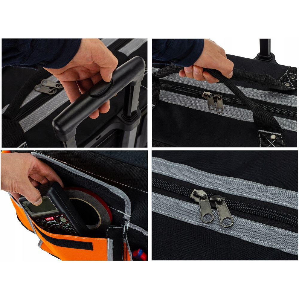 Кофр для инструмента на колесах NEO (арт. 84-302) материал - полиэстер 600 D, гарантирующий прочность на долгие годы. Конструкция, швы и замки усилены. Телескопическая ручка с блокиратором и крепкие колеса облегчают транспортировку тяжелого инструмента. Кофр с крепкой ручкой, усиленной заклепками. 11 внутренних карманов и 6 наружных вместе с большим основным отделом обеспечат хранение и транспортировку большого количества инструментов.