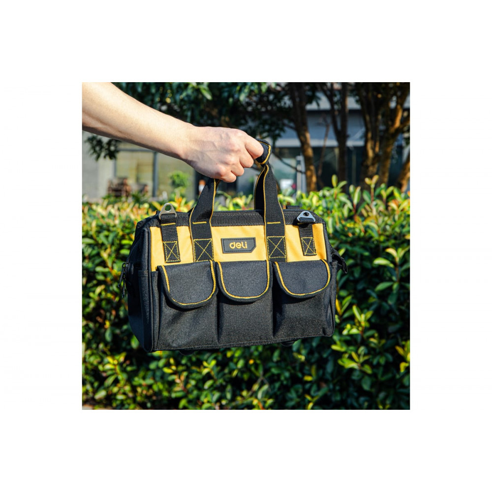 Влагостойкая конструкция сумки обеспечивает защиту инструментов от воздействия влаги и пыли, а молния и застежка гарантируют безопасность хранения и быстрый доступ к содержимому.Сумка DL430113 для инструментов, 14 карманов Deli представляет собой надежное и функциональное решение для организации и переноски инструментов в домашних условиях или на работе.