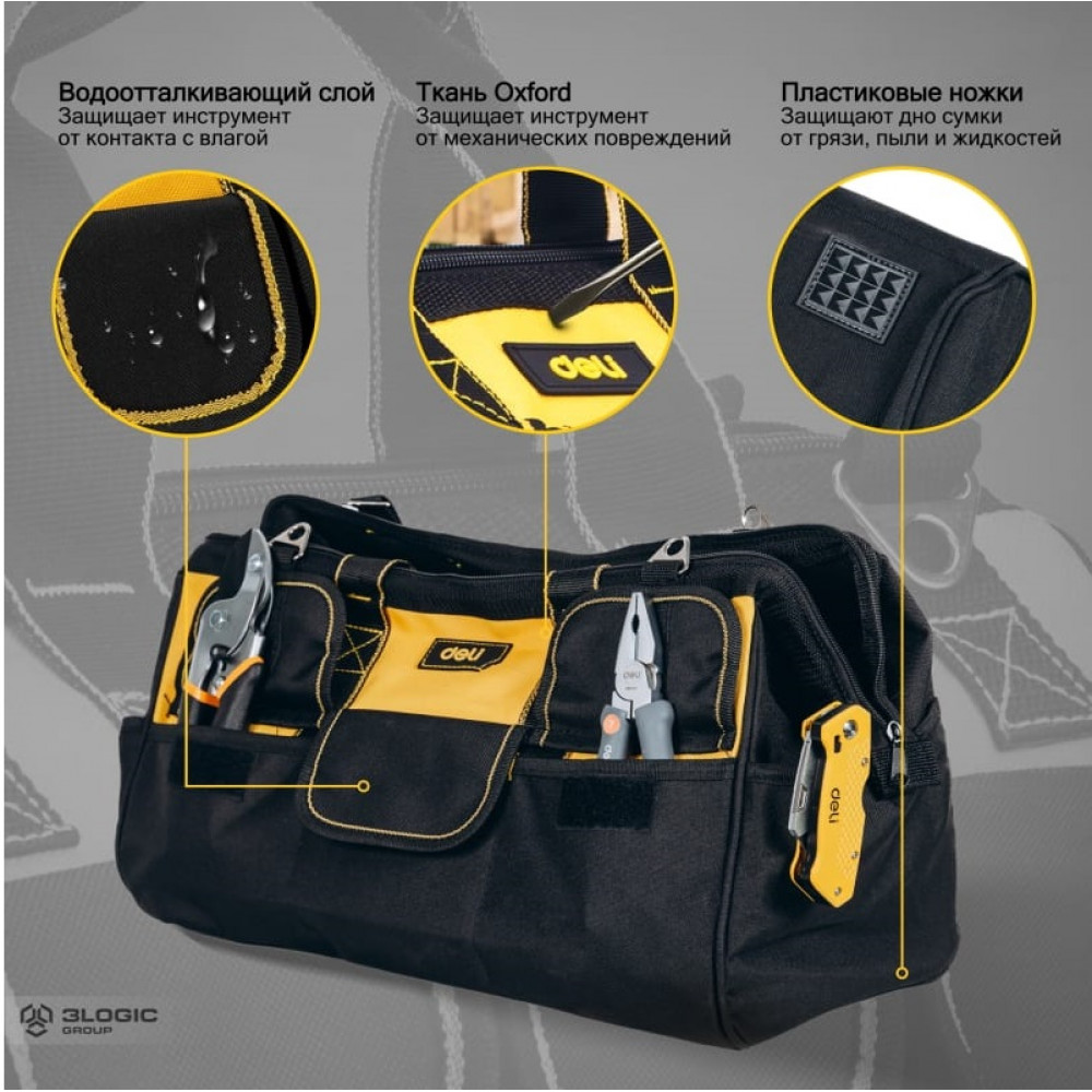 Благодаря своим размерам 430 x 200 x 290 мм и 14 карманам, данная модель представляет собой идеальное решение для хранения и перевозки инструментов различного размера и формы. Основание сумки усилено стальными прутьями, что обеспечивает дополнительную прочность и устойчивость к деформации.