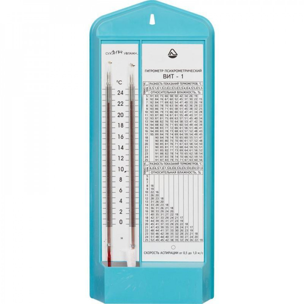 Гигрометр психрометрический ВИТ-1 предназначен для измерения относительной влажности воздуха и температуры в помещениях. На пластмассовом основании закреплены два термометра, температурная шкала и психрометрическая таблица. Комплектуется стеклянным питателем, имеет стеклянный штатив. Термометрическая жидкость гигрометра ВИТ-1 ― толуол. ВИТ-1 использует на материальных складах и помещениях закрытого типа. В питатель гигрометра заливают дистиллированную воду.
