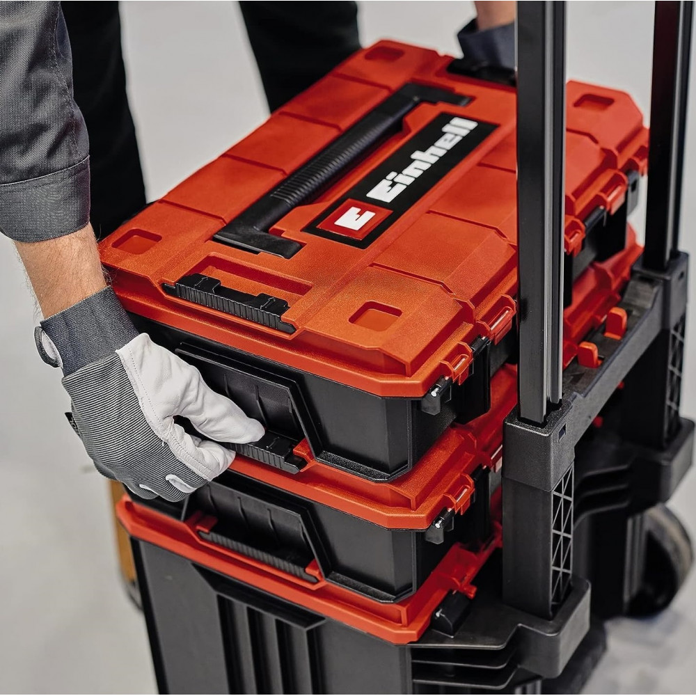 Einhell E-Case L — это часть модульной системы E-Case от Einhell, предназначенная для хранения и перевозки станков и инструментов. Благодаря практичной системе замков для соединения штабелированных ящиков обеспечивается систематическая и надёжная организация при хранении и перевозке.