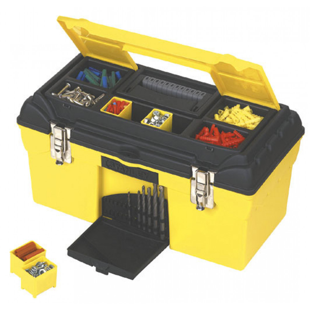 Ящик для инструментов 1-92-055 Condor от STANLEY выполнен из высококачественного пластика и имеет габариты равные 480х270х245 мм при весе в 2,2 кг. Крышка закрывается двумя надежными металлическими замками, а внутренняя часть ящика включает в себя съемный органайзер, в котором можно разместить всевозможные мелкогабаритные детали и приспособления. Также есть специальный отдел, в котором можно укомплектовать разные виды свёрл.