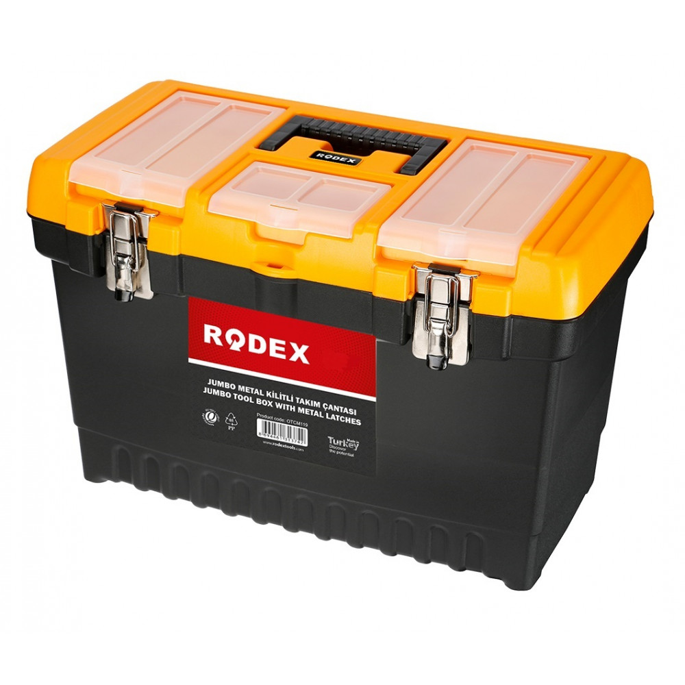 Ящик для инструмента RODEX предназначен для хранения, транспортировки, переноса и удобного доступа к ручному инструменту. Выполнен из прочного пластика, запирается на надежный металлический замок. Оснащен съемным лотком для часто используемых инструментов и органайзерами для мелочей с крышкой. Присутствует удобная утапливаемая пластиковая ручка для комфортной транспортировки ящика.