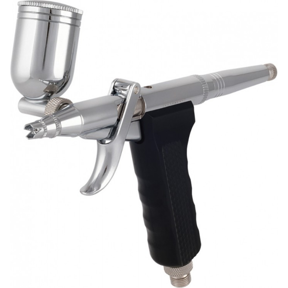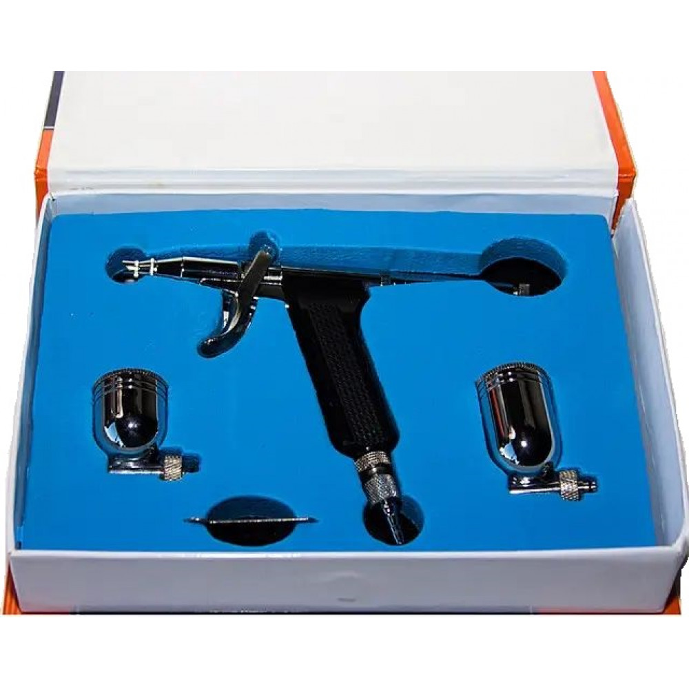 В комплект с аэрографом входят и другие специальные приспособления, такие как мерная пипетка, штуцер для шланга, особый ключ для сопла. Бачки аэрографа рассчитаны на 7 и 9 мл, а работает он при давлении равном 1-4 бар. С помощью сопла диаметром 0,3 мм можно наносить на нужную поверхность пятна размером от 50 мм до 100 мм.