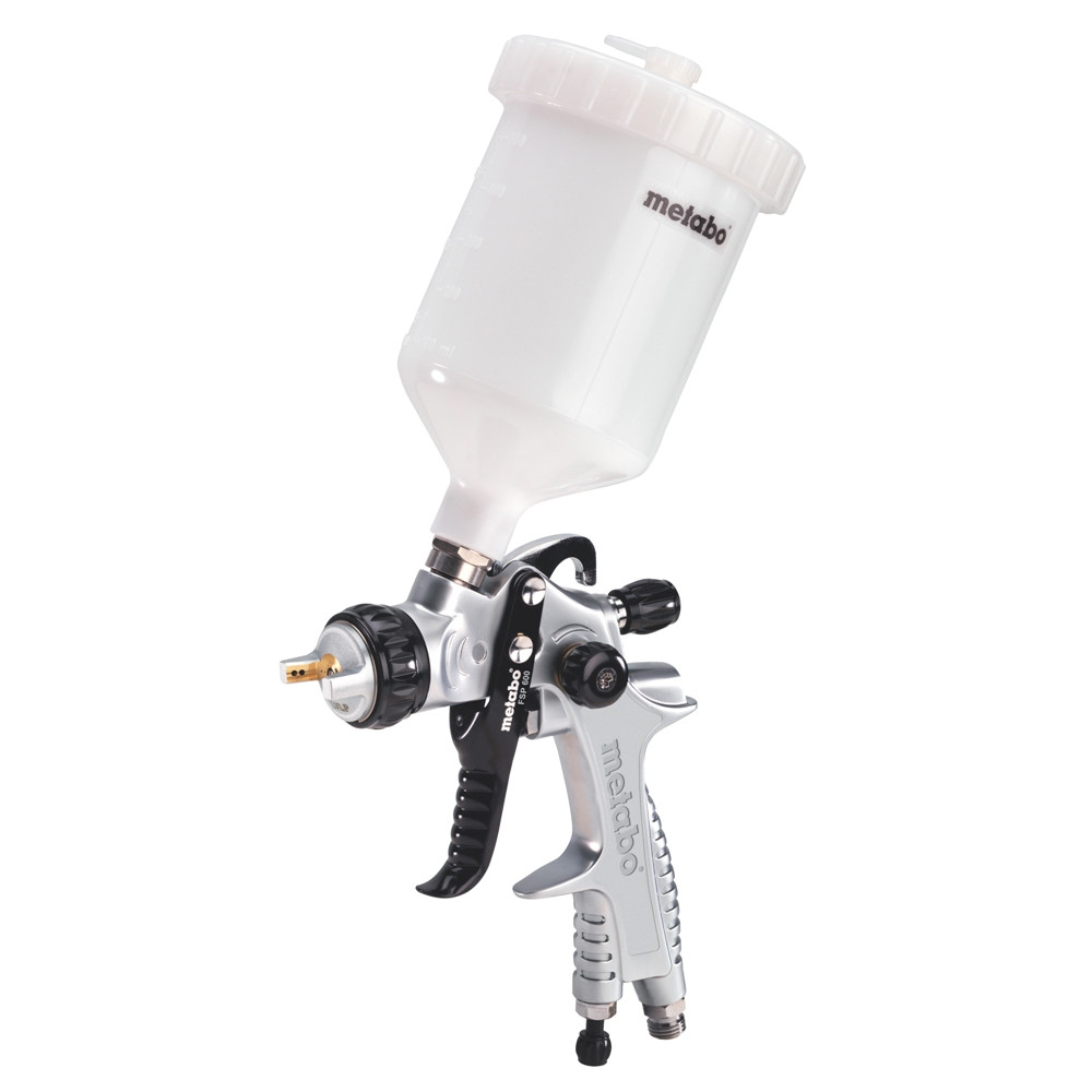Пневматический краскопульт Metabo FSP 600 HVLP характеризуется незначительным избыточным распылением, максимальной эффективной передачи при незначительном расходе воздуха. Для широкой и круглой струи предусмотрена плавная регулировка. HVLP (High Volume, Low Pressure - большой объем, низкое давление): мин. рабочее давление 0,7 бар на наборе насадок, интенсивность передачи около 70%.