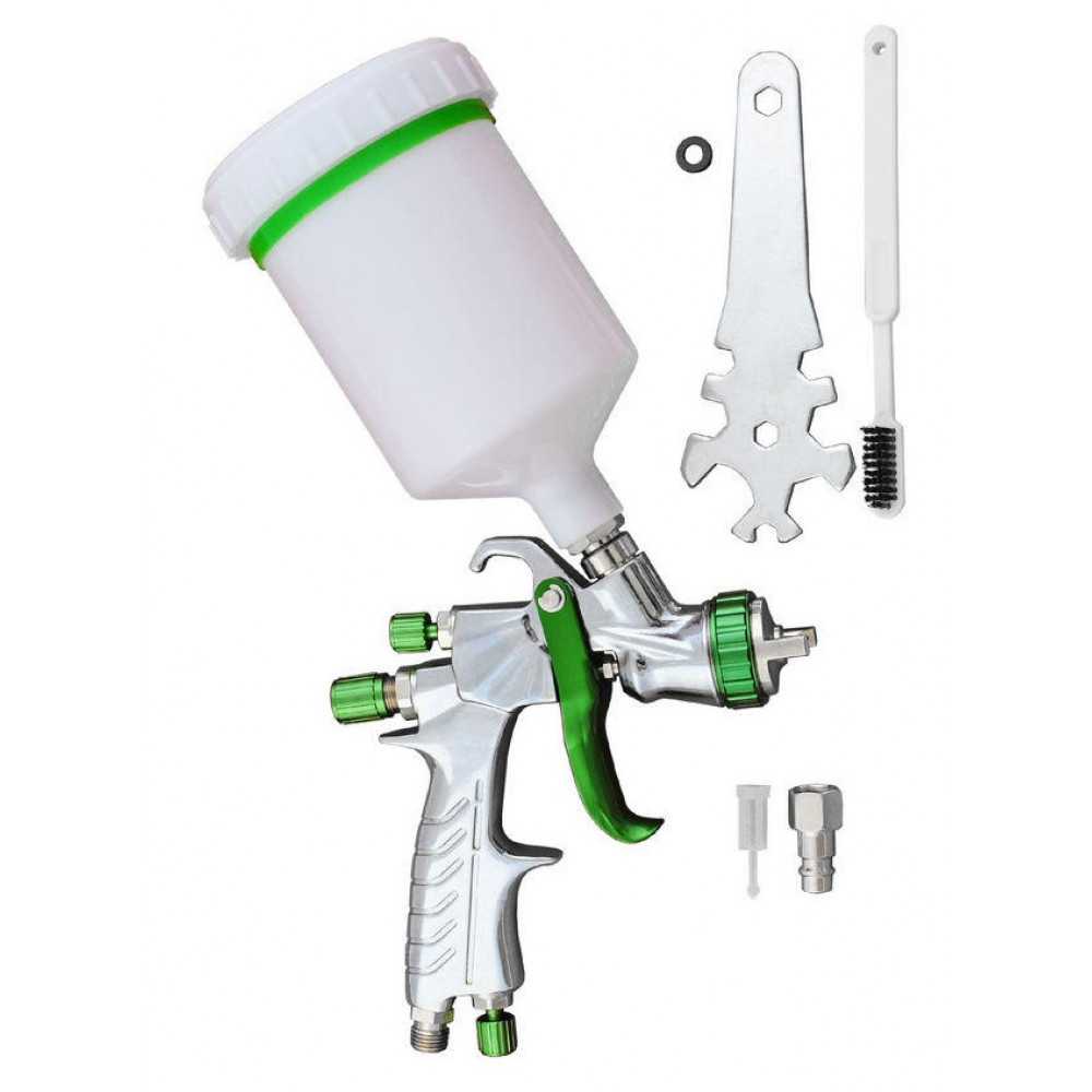 Этот пистолет отличается большой производительностью, позволяя наносить более чем 65 % краски на поверхность, что очень экономно. Размер наносимого материала при покраске составляет 160-240 мм. Пистолет оборудован верхним бачком с объемом 600 мл и работает под давлением 2-3 бар с расходом от 190 до 240 литров в минуту. Форсунка пистолета имеет диаметр 1,3 мм.