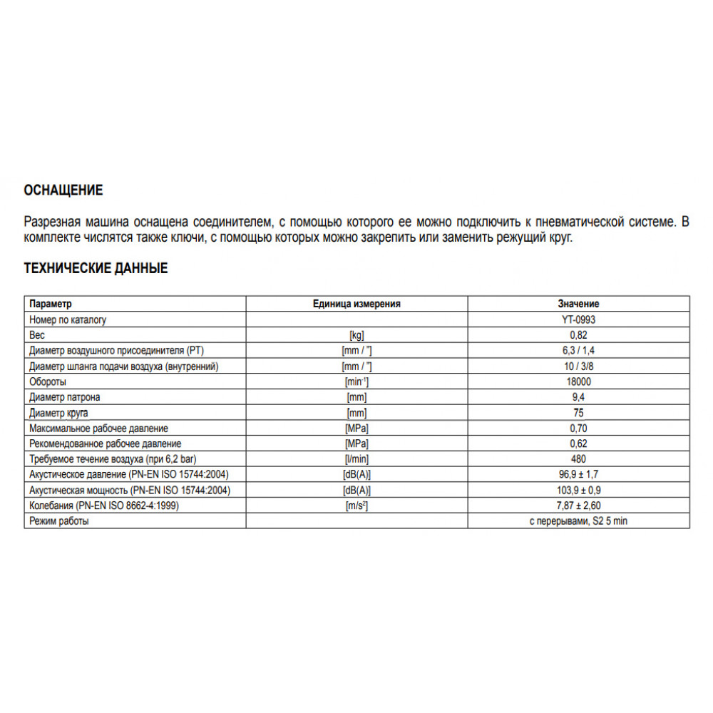 Пневматический резак YT-0993 имеет такие технические характеристики: вес 0,82кг, диаметр воздушного соединения ¼, диаметр шланга подачи воздуха 3/8, диаметр патрона равен 9,4мм, диаметр круга 75мм. Устройство работает на скорости 18000 оборотов в минуту под давлением 0,7Мпа.