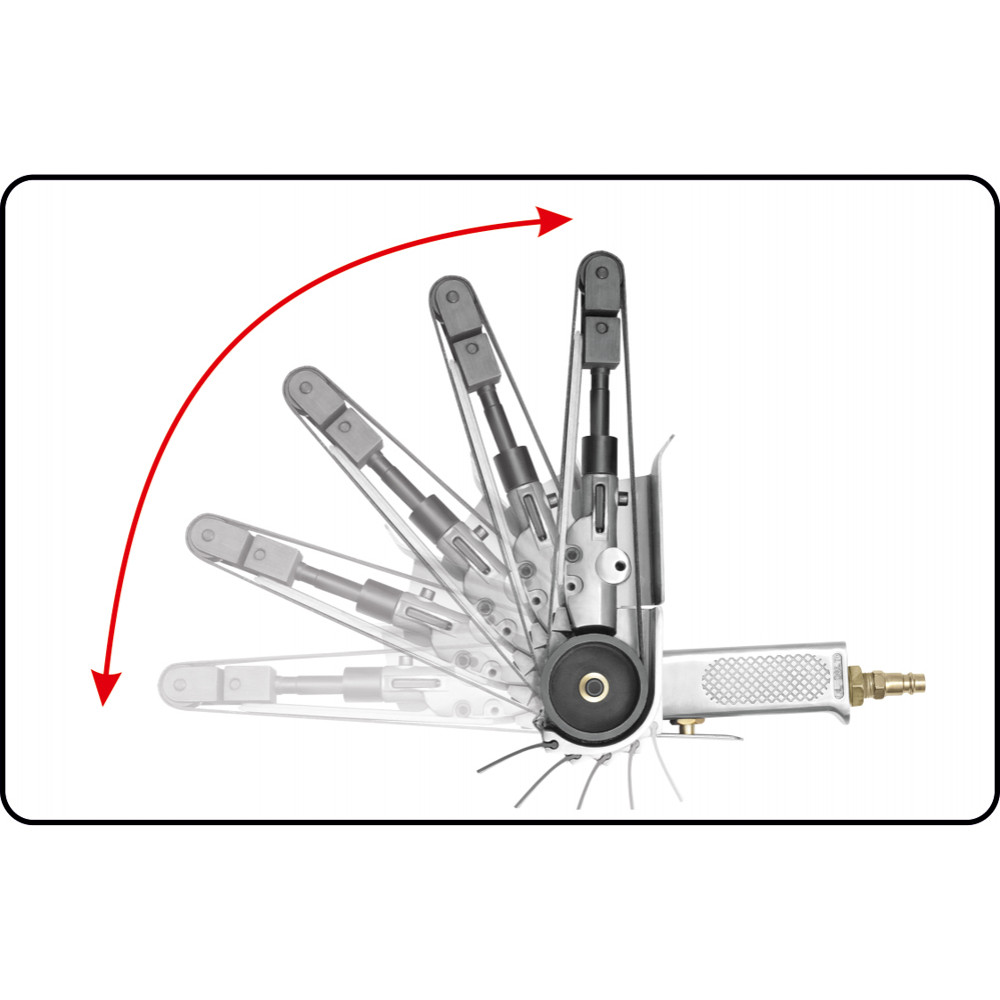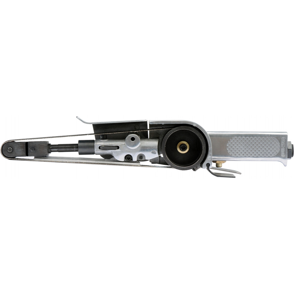 Размеры рабочей ленты шлифмашины составляют 20х520мм, инструмент работает на скорости 20000 оборотов в минуту. Шлифмашина использует сжатый воздух под давлением 0,63Мпа с расходом 200л/мин. Вес инструмента равен 1,23кг.