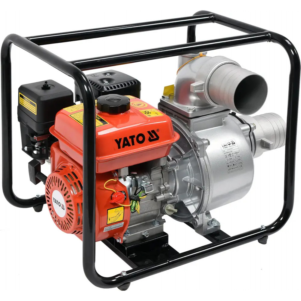 Эффективный насос внутреннего сгорания для воды YATO. Встроенная стальная рама защищает его от повреждений и облегчает транспортировку. Идеально подходит для спасательных работ после аварий и стихийных бедствий. В насосе есть датчик уровня масла, который остановит двигатель или предотвратит запуск двигателя, если уровень масла в двигателе слишком низкий. Верхнее соединение - для выпуска воды, нижнее - для впуска. Шланги следует подсоединять к обоим муфтам с помощью соответствующих муфт, обеспечивающих полную герметичность соединений. В качестве топлива должен использоваться неэтилированный бензин с октановым числом не менее 93.