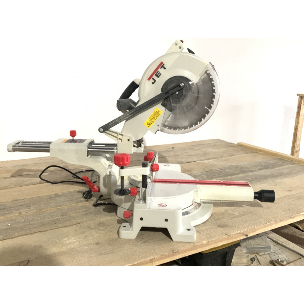 Торцовочно-усовочная пила JSMS-10L от марки Jet оснащена всеми необходимыми функциями распиловки с поворотом/наклоном, одновременно имея механизм протяжки, который обеспечивает продольный ход пильной части, что дает преимущество в длине реза и ширине распиливаемых за один проход деталей (она достигает 305 мм). Для нарезки шипов с края заготовки (усовки) и для выполнении глухих пазов (глубину при этом ограничивают регулируемым упором) пилу можно протягивать.