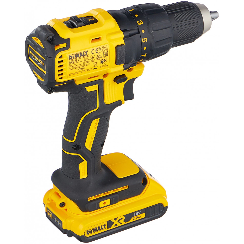 Дрель-шуруповерт DCD777D2T-QW работает на износостойком бесщеточном двигателе Brushless с двухскоростной системой. С ее помощью просверливаются отверстия диаметром до 30 мм в дереве и до 13 мм – в металлических изделиях. Электронная регулировка скорости при помощи триггера обеспечивает плавность и точность работы. 15-ступенчатый регулятор крутящего момента и 2 скорости позволяют точно задавать параметры режима работы c различными материалами