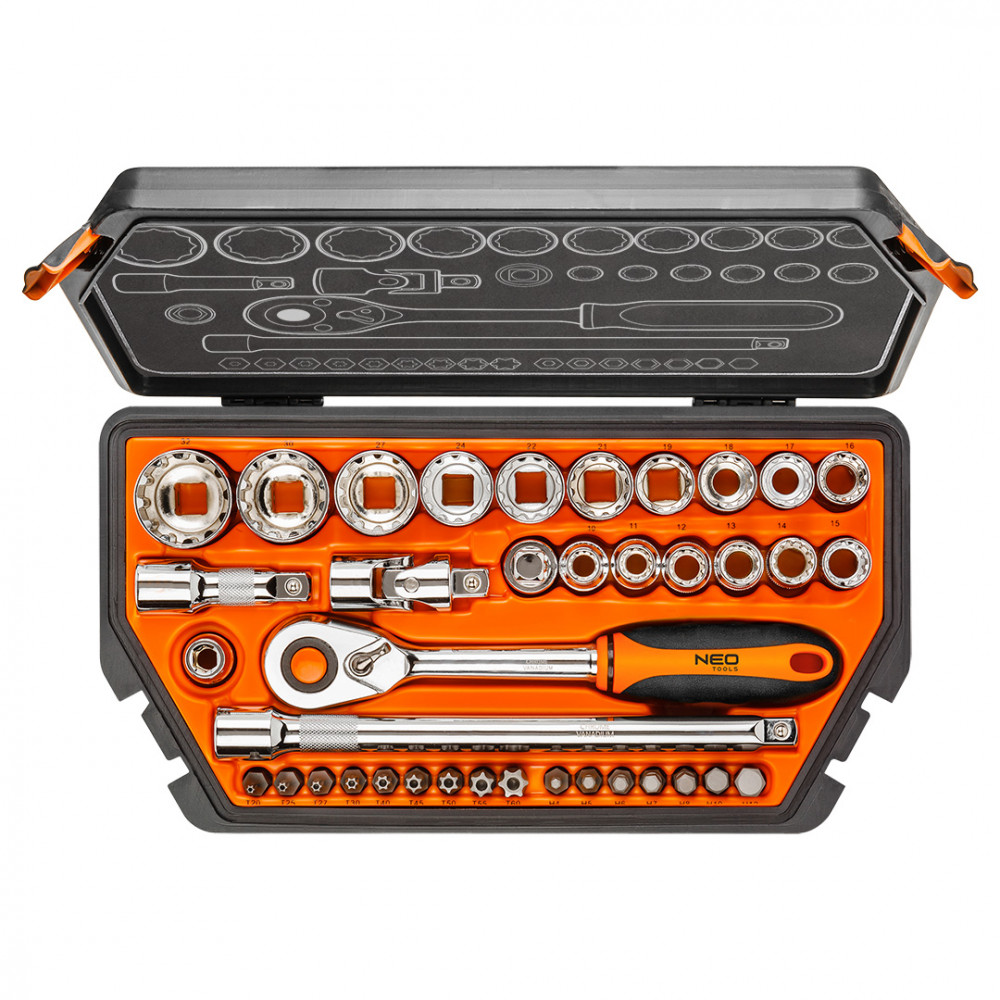 Набор торцевых ключей 1/2 от польского бренда NEO, состоит из 38 предметов, изготовленных из высококачественной хромованадиевой стали. В комплект входит: