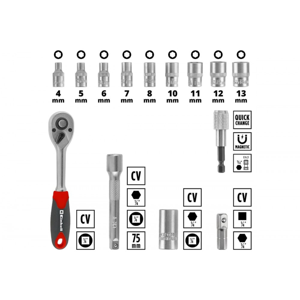 В комплект входят реверсивный ключ и переходник с шестигранника 1/4" на квадрат 1/4", а также удлинитель 75 мм 1/4" на квадрат 1/4".