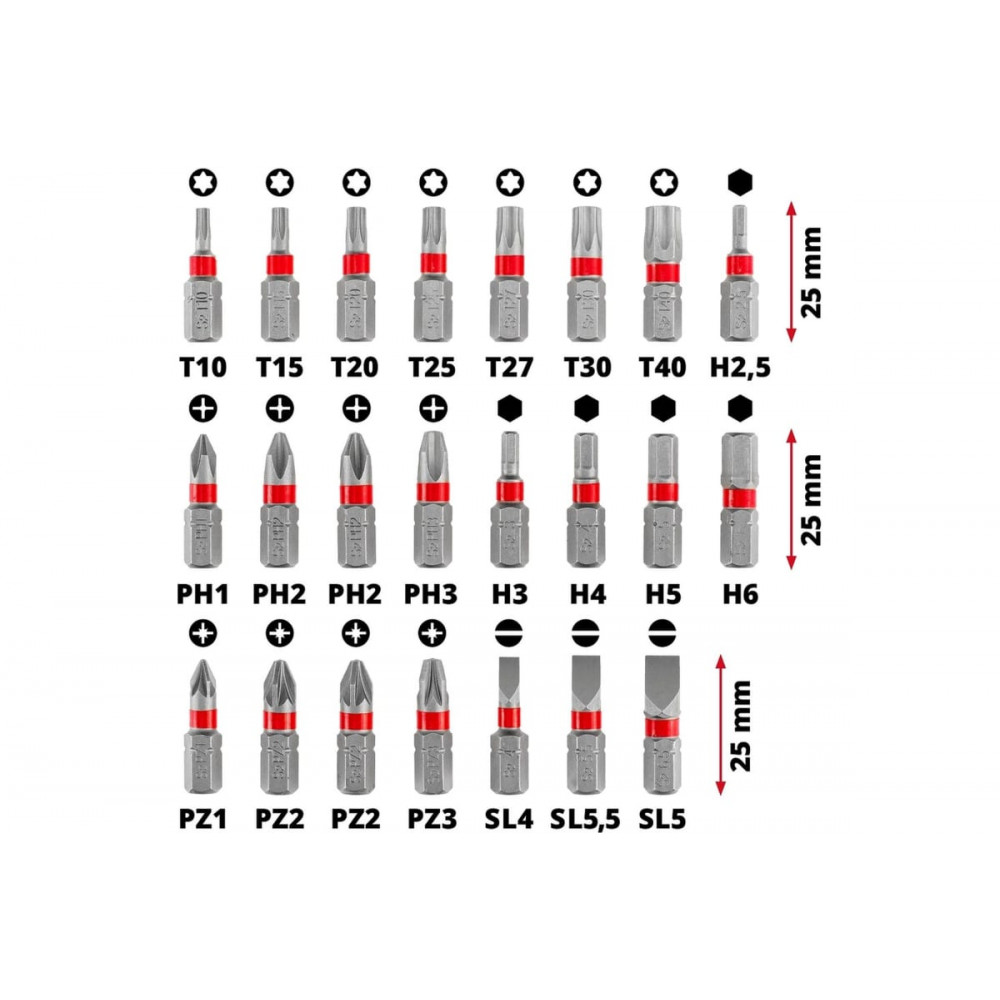 Длиной 25 мм, биты изготовлены из высококачественной стали S2 и предназначены для использования в дрелях и шуруповёртах.